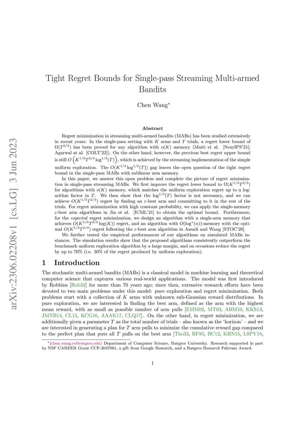 Regret minimization in streaming multi-armed bandits (MABs) has been studied extensively in recent years. In the single-pass setting with arms and trials, a regret lower bound of has been proved for any algorithm with memory (Maiti et al. [NeurIPS'21]; Agarwal at al. [COLT'22]). On the other hand, however, the previous best regret upper bound is still , which is achieved by the streaming implementation of the simple uniform exploration. The gap leaves the open question of the tight regret bound in the single-pass MABs with sublinear arm memory. In this paper, we answer this open problem and complete the picture of regret minimization in single-pass streaming MABs. We first improve the regret lower bound to for algorithms with memory, which matches the uniform exploration regret up to a logarithm factor in . We then show that the factor is not necessary, and we can achieve regret by finding an -best arm and committing to it in the rest of the trials. For regret minimization with high constant probability, we can apply the single-memory -best arm algorithms in Jin et al. [ICML'21] to obtain the optimal bound. Furthermore, for the expected regret minimization, we design an algorithm with a single-arm memory that achieves regret, and an algorithm with -memory with the optimal regret following the -best arm algorithm in Assadi and Wang [STOC'20]. We further tested the empirical performances of our algorithms. The simulation results show that the proposed algorithms consistently outperform the benchmark uniform exploration algorithm by a large margin, and on occasion, reduce the regret by up to 70%.