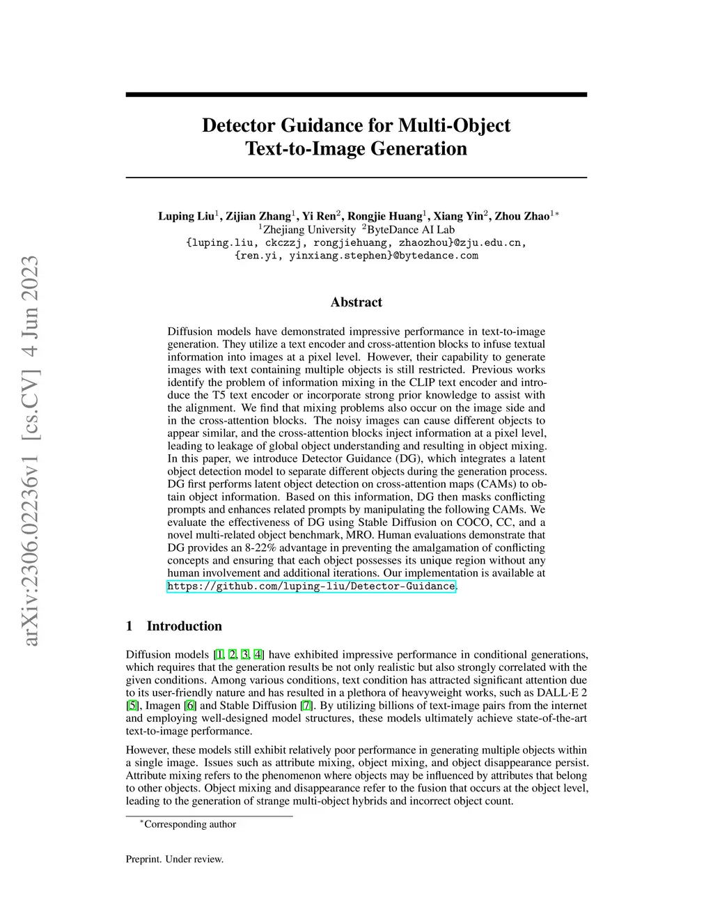 Diffusion models have demonstrated impressive performance in text-to-image generation. They utilize a text encoder and cross-attention blocks to infuse textual information into images at a pixel level. However, their capability to generate images with text containing multiple objects is still restricted. Previous works identify the problem of information mixing in the CLIP text encoder and introduce the T5 text encoder or incorporate strong prior knowledge to assist with the alignment. We find that mixing problems also occur on the image side and in the cross-attention blocks. The noisy images can cause different objects to appear similar, and the cross-attention blocks inject information at a pixel level, leading to leakage of global object understanding and resulting in object mixing. In this paper, we introduce Detector Guidance (DG), which integrates a latent object detection model to separate different objects during the generation process. DG first performs latent object detection on cross-attention maps (CAMs) to obtain object information. Based on this information, DG then masks conflicting prompts and enhances related prompts by manipulating the following CAMs. We evaluate the effectiveness of DG using Stable Diffusion on COCO, CC, and a novel multi-related object benchmark, MRO. Human evaluations demonstrate that DG provides an 8-22\% advantage in preventing the amalgamation of conflicting concepts and ensuring that each object possesses its unique region without any human involvement and additional iterations. Our implementation is available at \url{https://github.com/luping-liu/Detector-Guidance}.