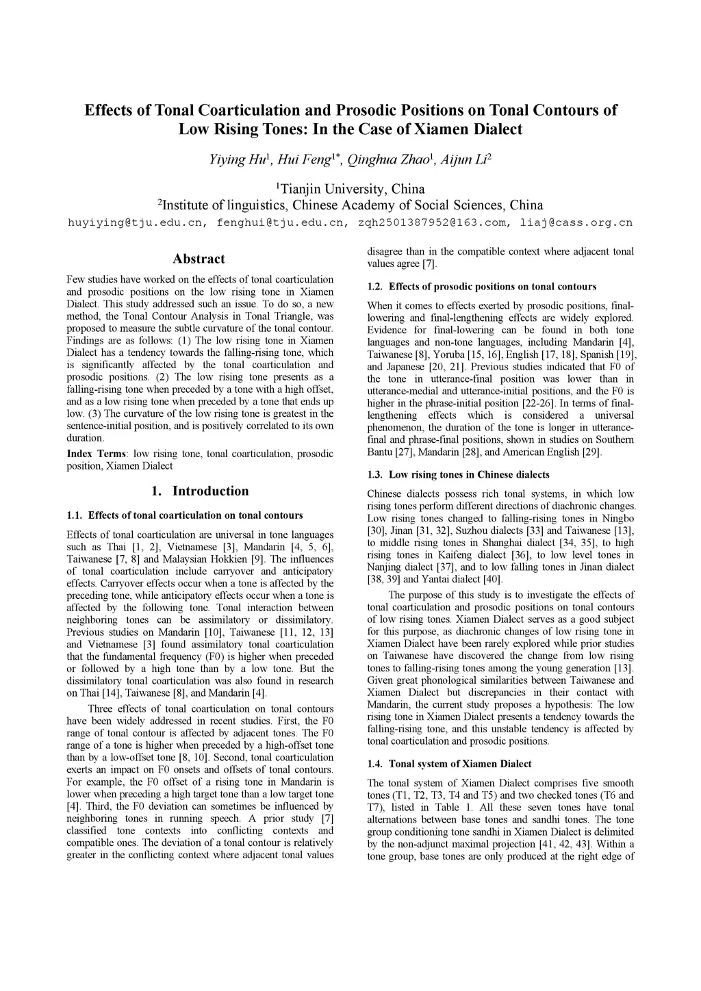 Few studies have worked on the effects of tonal coarticulation and prosodic positions on the low rising tone in Xiamen Dialect. This study addressed such an issue. To do so, a new method, the Tonal Contour Analysis in Tonal Triangle, was proposed to measure the subtle curvature of the tonal contour. Findings are as follows: (1) The low rising tone in Xiamen Dialect has a tendency towards the falling-rising tone, which is significantly affected by the tonal coarticulation and prosodic positions. (2) The low rising tone presents as a falling-rising tone when preceded by a tone with a high offset, and as a low rising tone when preceded by a tone that ends up low. (3) The curvature of the low rising tone is greatest in the sentence-initial position, and is positively correlated to its own duration.