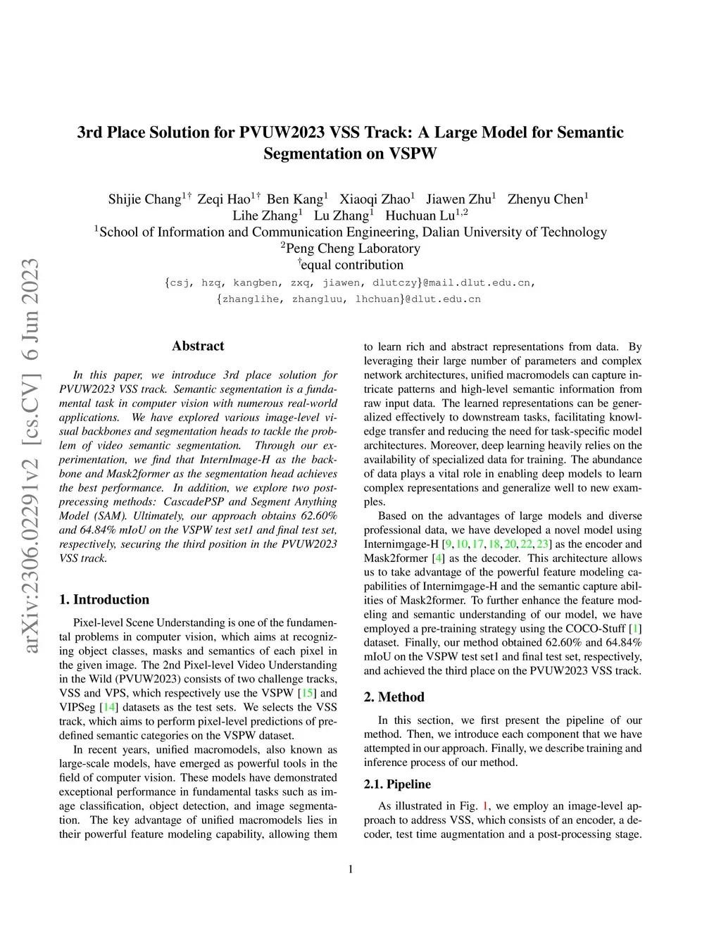 In this paper, we introduce 3rd place solution for PVUW2023 VSS track. Semantic segmentation is a fundamental task in computer vision with numerous real-world applications. We have explored various image-level visual backbones and segmentation heads to tackle the problem of video semantic segmentation. Through our experimentation, we find that InternImage-H as the backbone and Mask2former as the segmentation head achieves the best performance. In addition, we explore two post-precessing methods: CascadePSP and Segment Anything Model (SAM). Ultimately, our approach obtains 62.60\% and 64.84\% mIoU on the VSPW test set1 and final test set, respectively, securing the third position in the PVUW2023 VSS track.