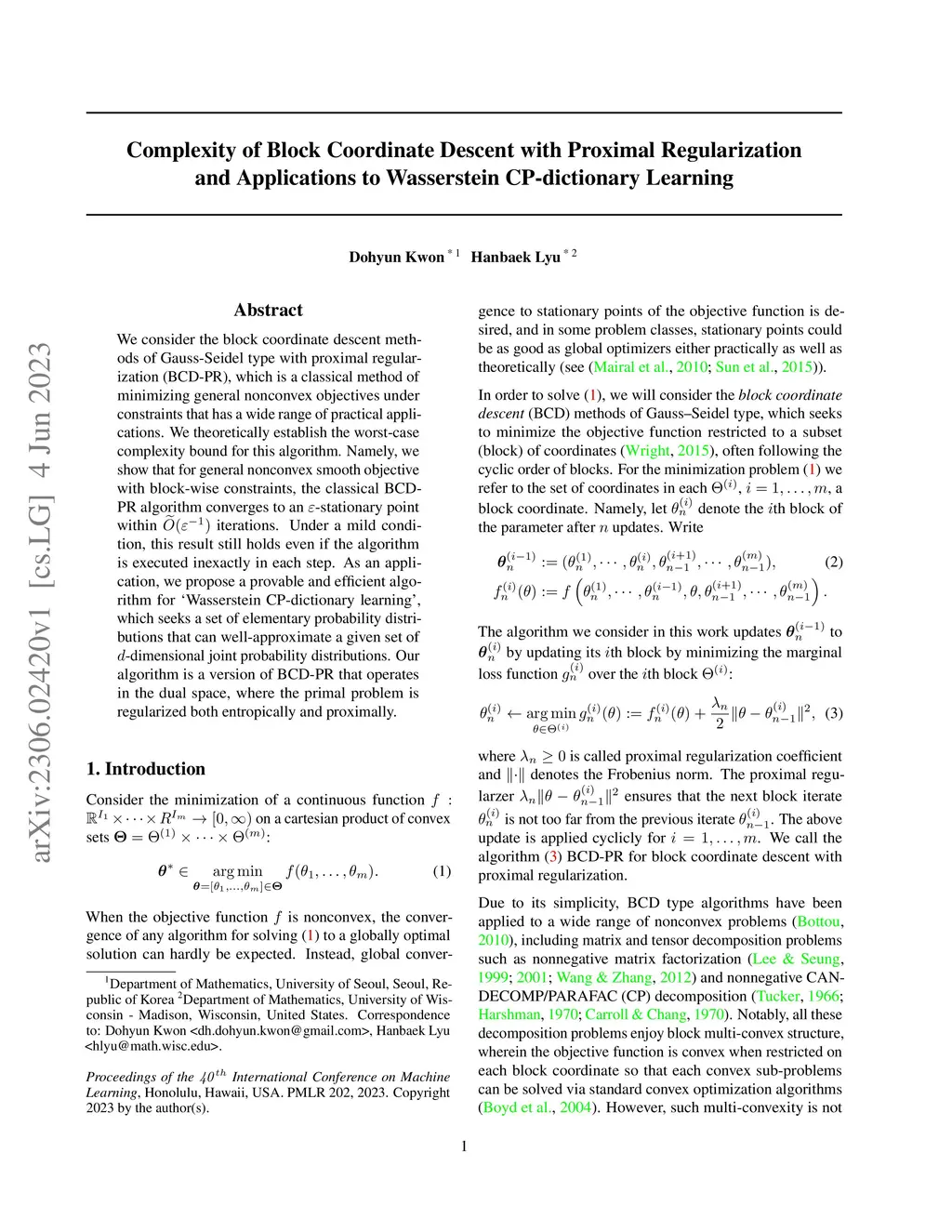 We consider the block coordinate descent methods of Gauss-Seidel type with proximal regularization (BCD-PR), which is a classical method of minimizing general nonconvex objectives under constraints that has a wide range of practical applications. We theoretically establish the worst-case complexity bound for this algorithm. Namely, we show that for general nonconvex smooth objectives with block-wise constraints, the classical BCD-PR algorithm converges to an epsilon-stationary point within O(1/epsilon) iterations. Under a mild condition, this result still holds even if the algorithm is executed inexactly in each step. As an application, we propose a provable and efficient algorithm for `Wasserstein CP-dictionary learning', which seeks a set of elementary probability distributions that can well-approximate a given set of d-dimensional joint probability distributions. Our algorithm is a version of BCD-PR that operates in the dual space, where the primal problem is regularized both entropically and proximally.
