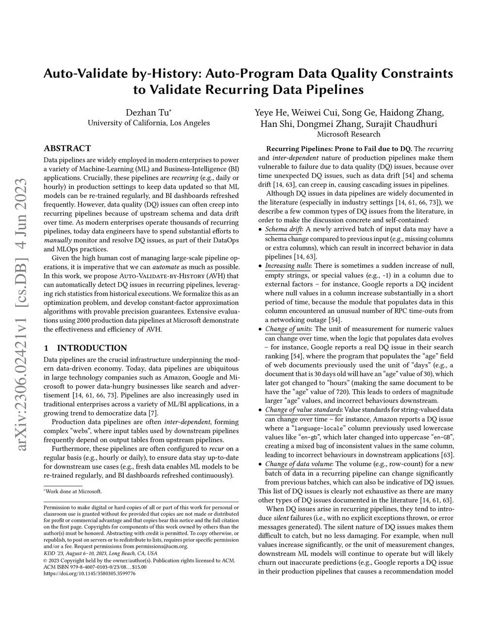 Data pipelines are widely employed in modern enterprises to power a variety of Machine-Learning (ML) and Business-Intelligence (BI) applications. Crucially, these pipelines are \emph{recurring} (e.g., daily or hourly) in production settings to keep data updated so that ML models can be re-trained regularly, and BI dashboards refreshed frequently. However, data quality (DQ) issues can often creep into recurring pipelines because of upstream schema and data drift over time. As modern enterprises operate thousands of recurring pipelines, today data engineers have to spend substantial efforts to \emph{manually} monitor and resolve DQ issues, as part of their DataOps and MLOps practices. Given the high human cost of managing large-scale pipeline operations, it is imperative that we can \emph{automate} as much as possible. In this work, we propose Auto-Validate-by-History (AVH) that can automatically detect DQ issues in recurring pipelines, leveraging rich statistics from historical executions. We formalize this as an optimization problem, and develop constant-factor approximation algorithms with provable precision guarantees. Extensive evaluations using 2000 production data pipelines at Microsoft demonstrate the effectiveness and efficiency of AVH.