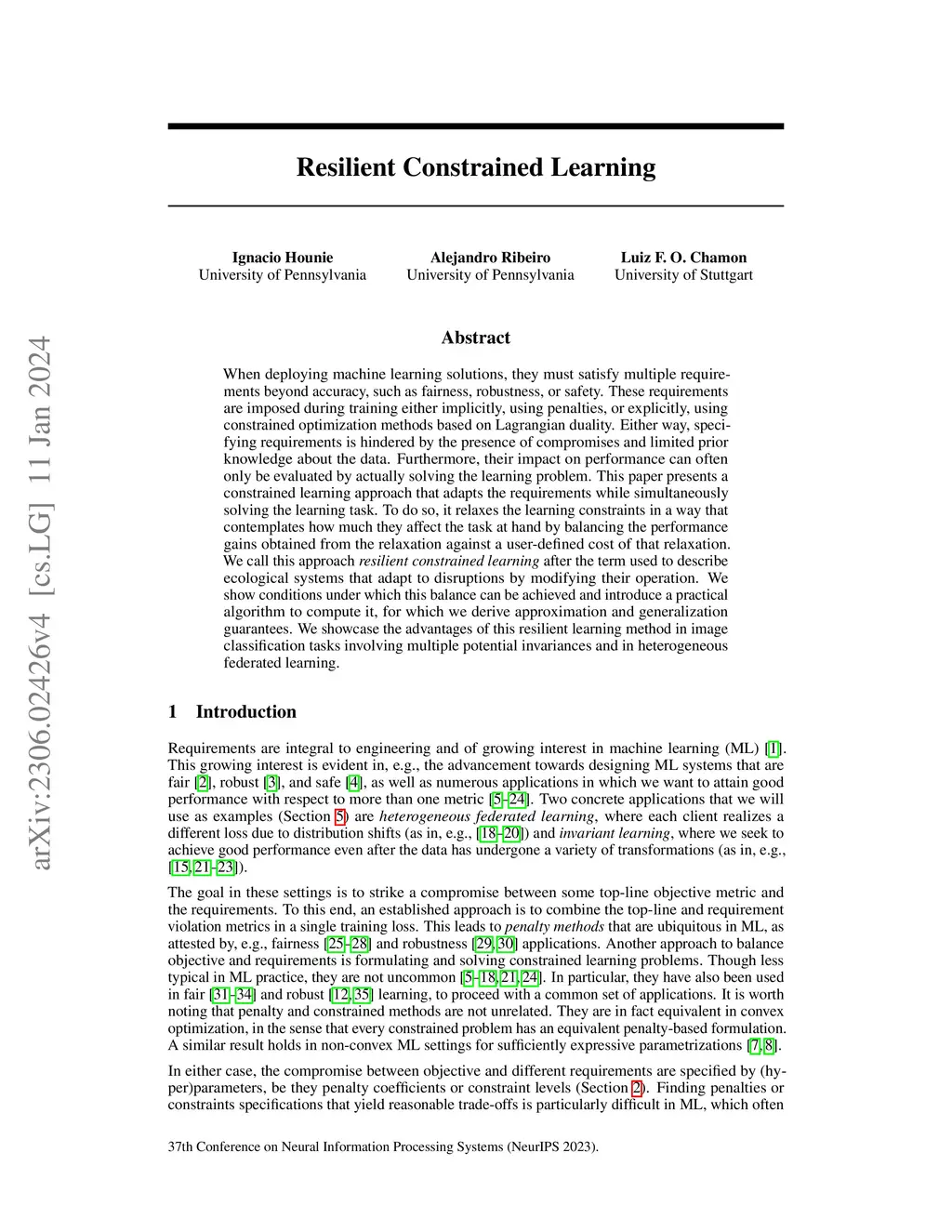 When deploying machine learning solutions, they must satisfy multiple requirements beyond accuracy, such as fairness, robustness, or safety. These requirements are imposed during training either implicitly, using penalties, or explicitly, using constrained optimization methods based on Lagrangian duality. Either way, specifying requirements is hindered by the presence of compromises and limited prior knowledge about the data. Furthermore, their impact on performance can often only be evaluated by actually solving the learning problem. This paper presents a constrained learning approach that adapts the requirements while simultaneously solving the learning task. To do so, it relaxes the learning constraints in a way that contemplates how much they affect the task at hand by balancing the performance gains obtained from the relaxation against a user-defined cost of that relaxation. We call this approach resilient constrained learning after the term used to describe ecological systems that adapt to disruptions by modifying their operation. We show conditions under which this balance can be achieved and introduce a practical algorithm to compute it, for which we derive approximation and generalization guarantees. We showcase the advantages of this resilient learning method in image classification tasks involving multiple potential invariances and in heterogeneous federated learning.