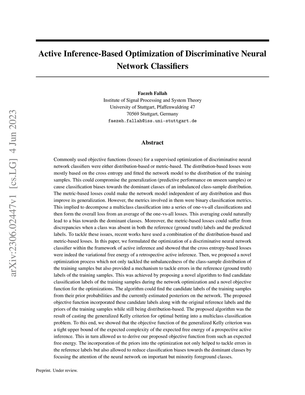Commonly used objective functions (losses) for a supervised optimization of discriminative neural network classifiers were either distribution-based or metric-based. The distribution-based losses could compromise the generalization or cause classification biases towards the dominant classes of an imbalanced class-sample distribution. The metric-based losses could make the network model independent of any distribution and thus improve its generalization. However, they could still be biased towards the dominant classes and could suffer from discrepancies when a class was absent in both the reference (ground truth) and the predicted labels. In this paper, we proposed a novel optimization process which not only tackled the unbalancedness of the class-sample distribution of the training samples but also provided a mechanism to tackle errors in the reference labels of the training samples. This was achieved by proposing a novel algorithm to find candidate classification labels of the training samples from their prior probabilities and the currently estimated posteriors on the network and a novel objective function for the optimizations. The algorithm was the result of casting the generalized Kelly criterion for optimal betting into a multiclass classification problem. The proposed objective function was the expected free energy of a prospective active inference and could incorporate the candidate labels, the original reference labels, and the priors of the training samples while still being distribution-based. The incorporation of the priors into the optimization not only helped to tackle errors in the reference labels but also allowed to reduce classification biases towards the dominant classes by focusing the attention of the neural network on important but minority foreground classes.