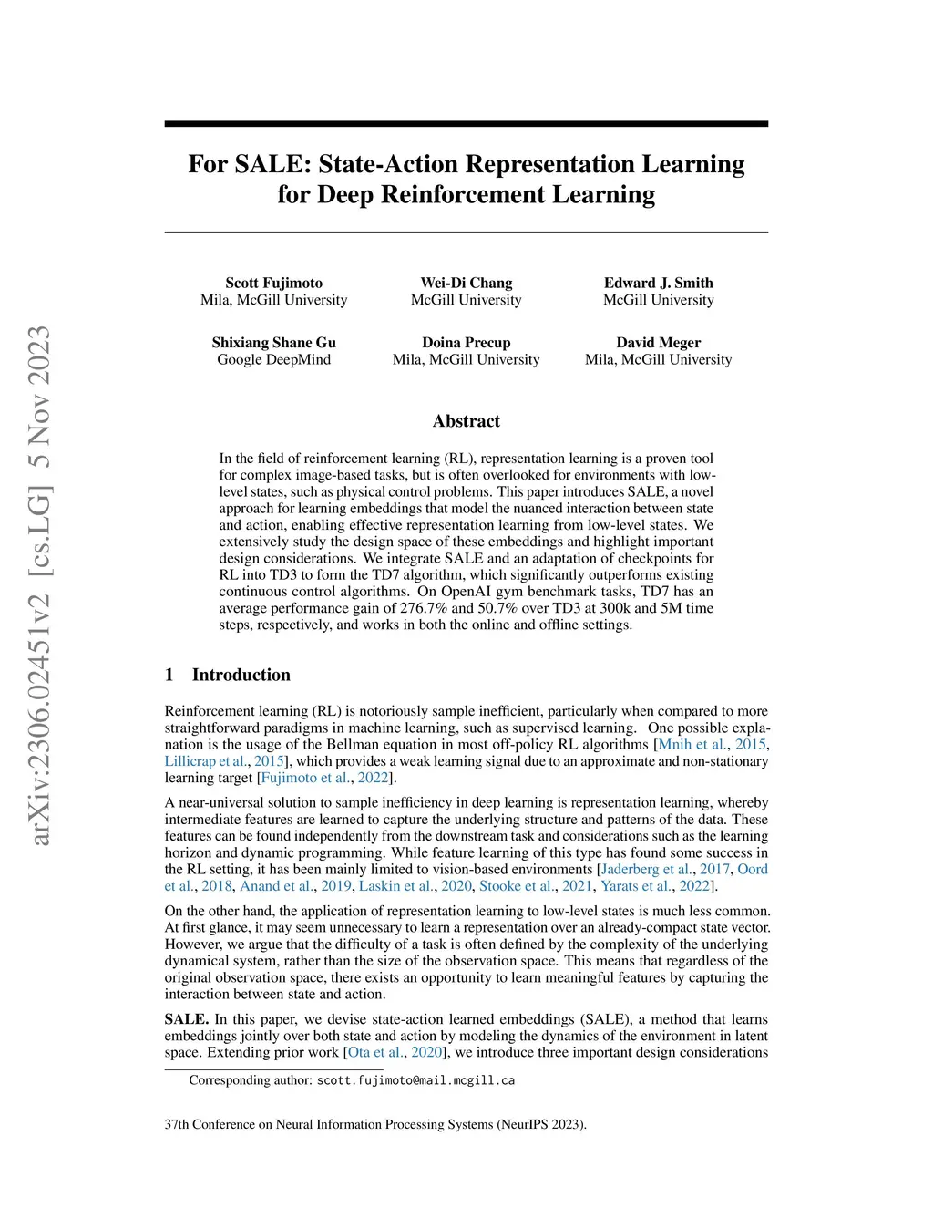 In the field of reinforcement learning (RL), representation learning is a proven tool for complex image-based tasks, but is often overlooked for environments with low-level states, such as physical control problems. This paper introduces SALE, a novel approach for learning embeddings that model the nuanced interaction between state and action, enabling effective representation learning from low-level states. We extensively study the design space of these embeddings and highlight important design considerations. We integrate SALE and an adaptation of checkpoints for RL into TD3 to form the TD7 algorithm, which significantly outperforms existing continuous control algorithms. On OpenAI gym benchmark tasks, TD7 has an average performance gain of 276.7% and 50.7% over TD3 at 300k and 5M time steps, respectively, and works in both the online and offline settings.