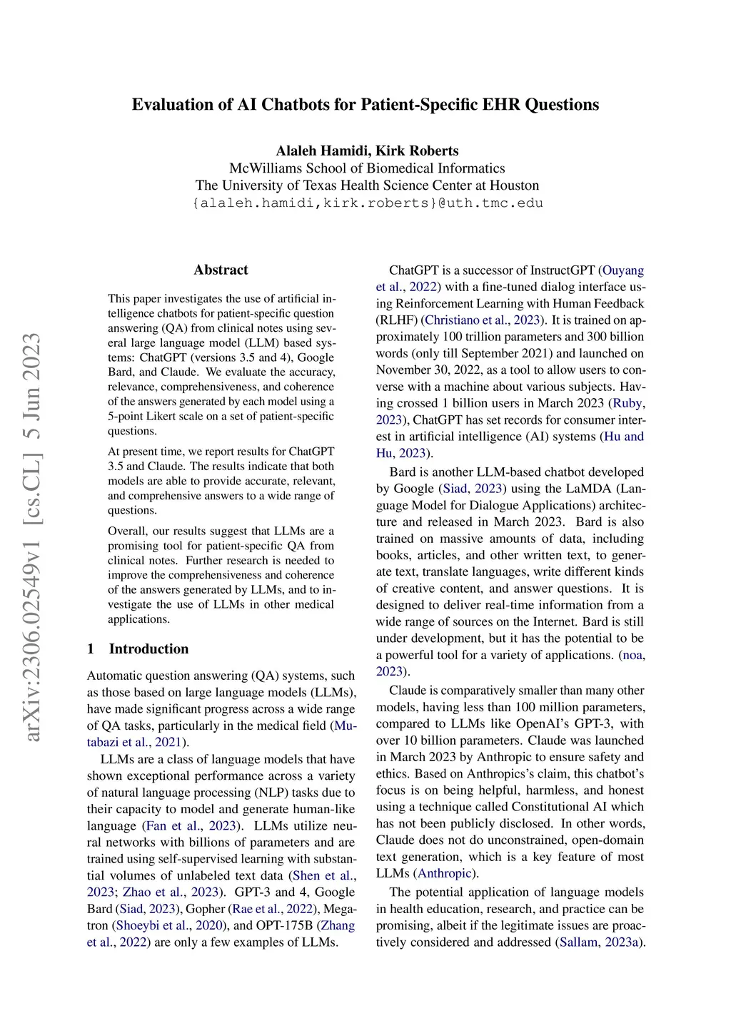This paper investigates the use of artificial intelligence chatbots for patient-specific question answering (QA) from clinical notes using several large language model (LLM) based systems: ChatGPT (versions 3.5 and 4), Google Bard, and Claude. We evaluate the accuracy, relevance, comprehensiveness, and coherence of the answers generated by each model using a 5-point Likert scale on a set of patient-specific questions.