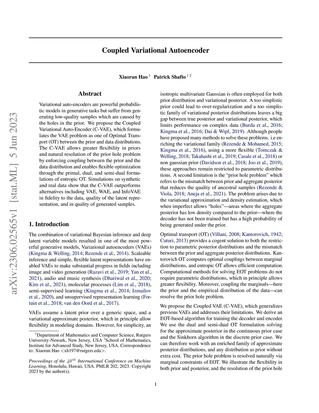 Variational auto-encoders are powerful probabilistic models in generative tasks but suffer from generating low-quality samples which are caused by the holes in the prior. We propose the Coupled Variational Auto-Encoder (C-VAE), which formulates the VAE problem as one of Optimal Transport (OT) between the prior and data distributions. The C-VAE allows greater flexibility in priors and natural resolution of the prior hole problem by enforcing coupling between the prior and the data distribution and enables flexible optimization through the primal, dual, and semi-dual formulations of entropic OT. Simulations on synthetic and real data show that the C-VAE outperforms alternatives including VAE, WAE, and InfoVAE in fidelity to the data, quality of the latent representation, and in quality of generated samples.