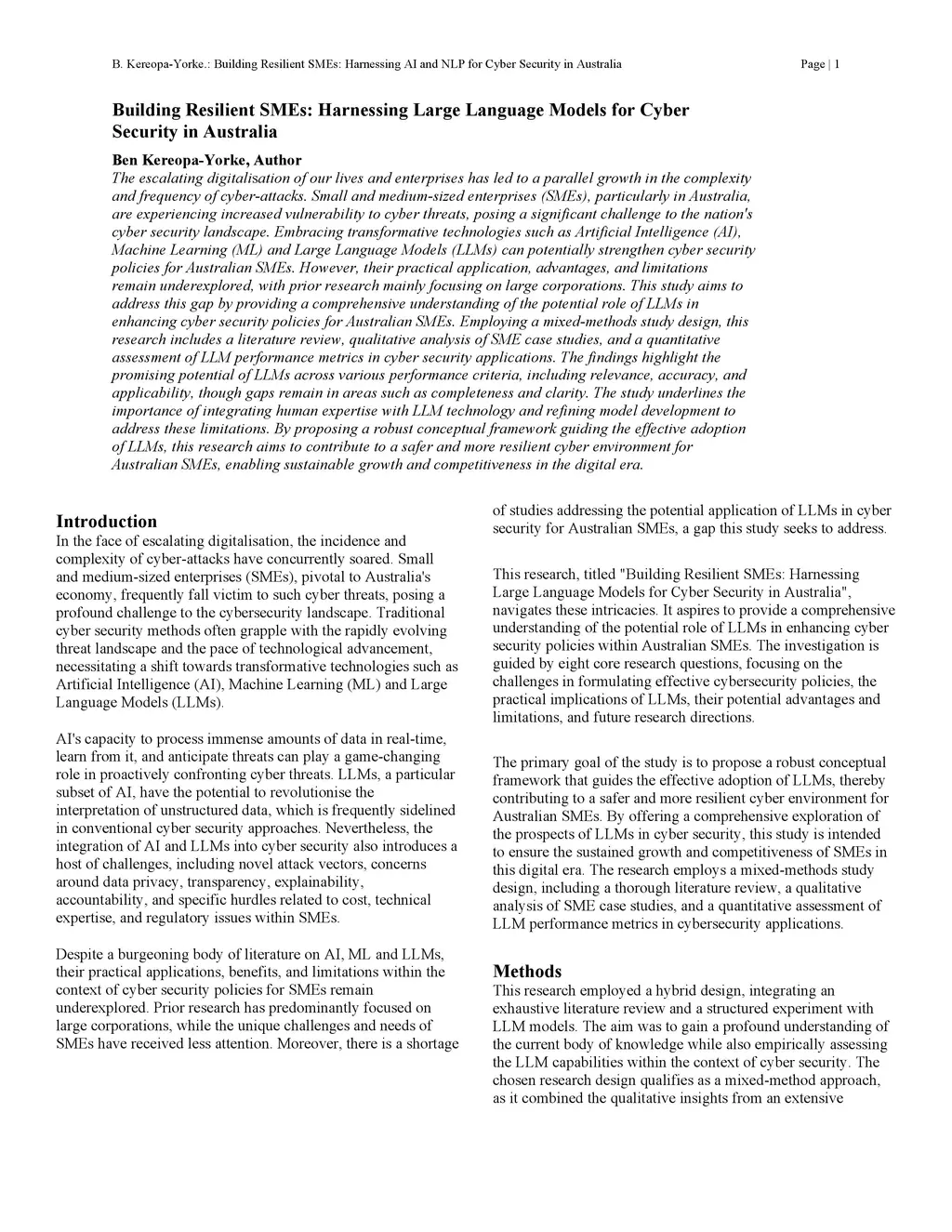 The escalating digitalisation of our lives and enterprises has led to a parallel growth in the complexity and frequency of cyber-attacks. Small and medium-sized enterprises (SMEs), particularly in Australia, are experiencing increased vulnerability to cyber threats, posing a significant challenge to the nation's cyber security landscape. Embracing transformative technologies such as Artificial Intelligence (AI), Machine Learning (ML) and Large Language Models (LLMs) can potentially strengthen cyber security policies for Australian SMEs. However, their practical application, advantages, and limitations remain underexplored, with prior research mainly focusing on large corporations. This study aims to address this gap by providing a comprehensive understanding of the potential role of LLMs in enhancing cyber security policies for Australian SMEs. Employing a mixed-methods study design, this research includes a literature review, qualitative analysis of SME case studies, and a quantitative assessment of LLM performance metrics in cyber security applications. The findings highlight the promising potential of LLMs across various performance criteria, including relevance, accuracy, and applicability, though gaps remain in areas such as completeness and clarity. The study underlines the importance of integrating human expertise with LLM technology and refining model development to address these limitations. By proposing a robust conceptual framework guiding the effective adoption of LLMs, this research aims to contribute to a safer and more resilient cyber environment for Australian SMEs, enabling sustainable growth and competitiveness in the digital era.