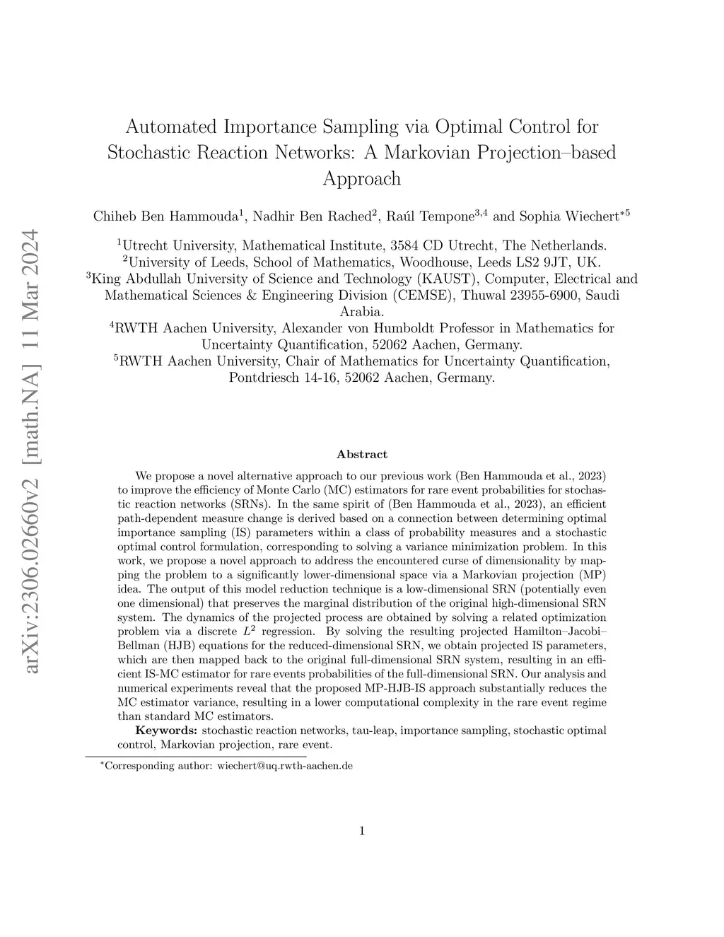 We propose a novel alternative approach to our previous work (Ben Hammouda et al., 2023) to improve the efficiency of Monte Carlo (MC) estimators for rare event probabilities for stochastic reaction networks (SRNs). In the same spirit of (Ben Hammouda et al., 2023), an efficient path-dependent measure change is derived based on a connection between determining optimal importance sampling (IS) parameters within a class of probability measures and a stochastic optimal control formulation, corresponding to solving a variance minimization problem. In this work, we propose a novel approach to address the encountered curse of dimensionality by mapping the problem to a significantly lower-dimensional space via a Markovian projection (MP) idea. The output of this model reduction technique is a low-dimensional SRN (potentially even one dimensional) that preserves the marginal distribution of the original high-dimensional SRN system. The dynamics of the projected process are obtained by solving a related optimization problem via a discrete regression. By solving the resulting projected Hamilton-Jacobi-Bellman (HJB) equations for the reduced-dimensional SRN, we obtain projected IS parameters, which are then mapped back to the original full-dimensional SRN system, resulting in an efficient IS-MC estimator for rare events probabilities of the full-dimensional SRN. Our analysis and numerical experiments reveal that the proposed MP-HJB-IS approach substantially reduces the MC estimator variance, resulting in a lower computational complexity in the rare event regime than standard MC estimators.
