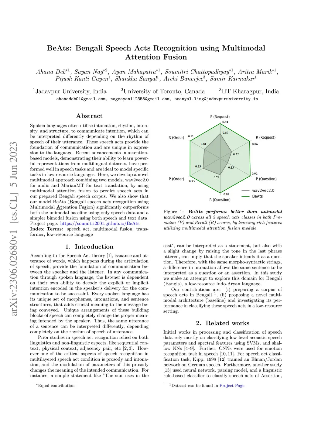 Spoken languages often utilise intonation, rhythm, intensity, and structure, to communicate intention, which can be interpreted differently depending on the rhythm of speech of their utterance. These speech acts provide the foundation of communication and are unique in expression to the language. Recent advancements in attention-based models, demonstrating their ability to learn powerful representations from multilingual datasets, have performed well in speech tasks and are ideal to model specific tasks in low resource languages. Here, we develop a novel multimodal approach combining two models, wav2vec2.0 for audio and MarianMT for text translation, by using multimodal attention fusion to predict speech acts in our prepared Bengali speech corpus. We also show that our model BeAts (ngali speech acts recognition using Multimodal tention Fuion) significantly outperforms both the unimodal baseline using only speech data and a simpler bimodal fusion using both speech and text data. Project page: https://soumitri2001.github.io/BeAts