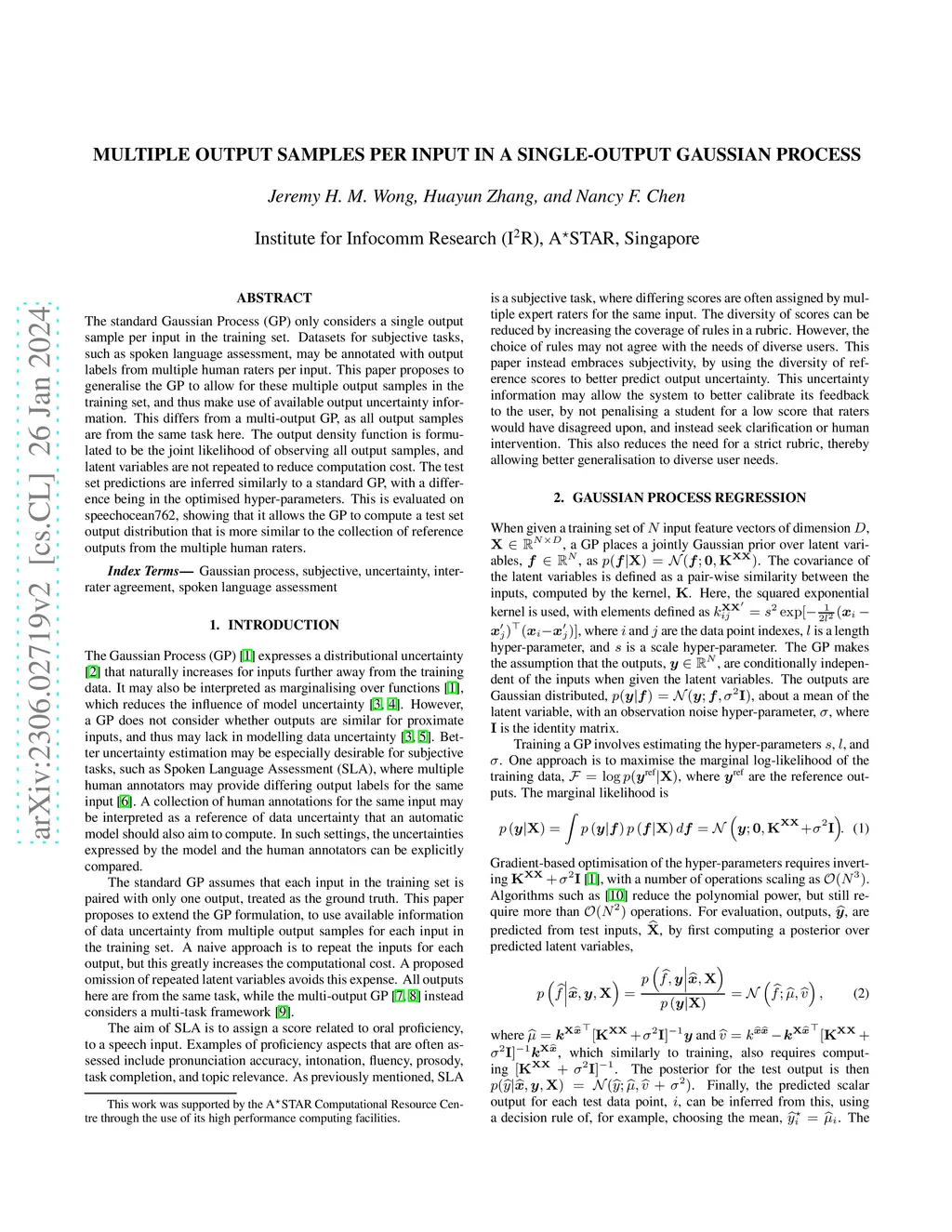 The standard Gaussian Process (GP) only considers a single output sample per input in the training set. Datasets for subjective tasks, such as spoken language assessment, may be annotated with output labels from multiple human raters per input. This paper proposes to generalise the GP to allow for these multiple output samples in the training set, and thus make use of available output uncertainty information. This differs from a multi-output GP, as all output samples are from the same task here. The output density function is formulated to be the joint likelihood of observing all output samples, and latent variables are not repeated to reduce computation cost. The test set predictions are inferred similarly to a standard GP, with a difference being in the optimised hyper-parameters. This is evaluated on speechocean762, showing that it allows the GP to compute a test set output distribution that is more similar to the collection of reference outputs from the multiple human raters.