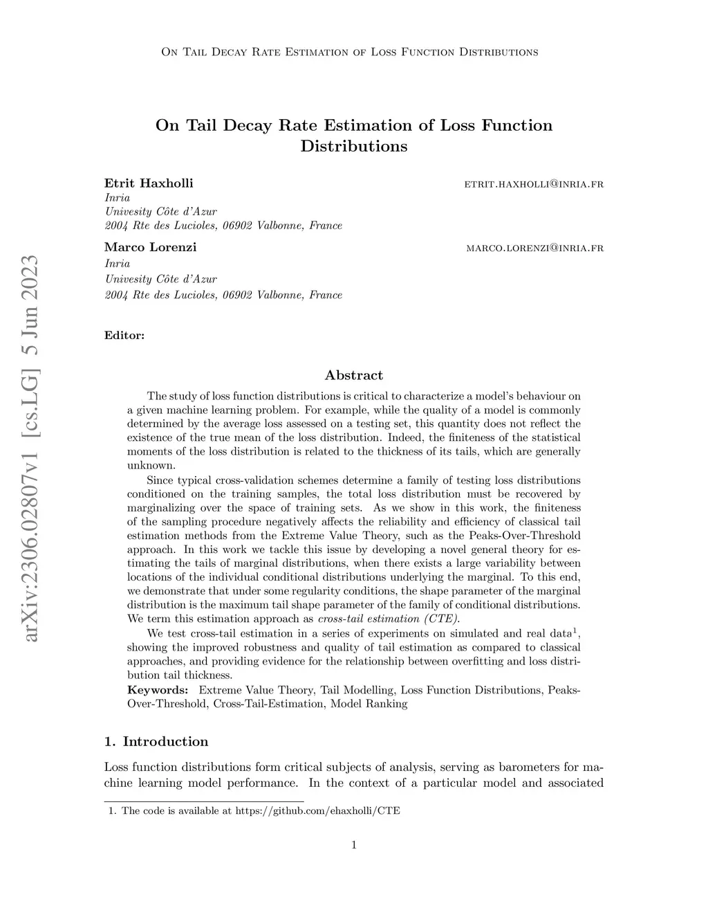 The study of loss function distributions is critical to characterize a model's behaviour on a given machine learning problem. For example, while the quality of a model is commonly determined by the average loss assessed on a testing set, this quantity does not reflect the existence of the true mean of the loss distribution. Indeed, the finiteness of the statistical moments of the loss distribution is related to the thickness of its tails, which are generally unknown. Since typical cross-validation schemes determine a family of testing loss distributions conditioned on the training samples, the total loss distribution must be recovered by marginalizing over the space of training sets. As we show in this work, the finiteness of the sampling procedure negatively affects the reliability and efficiency of classical tail estimation methods from the Extreme Value Theory, such as the Peaks-Over-Threshold approach. In this work we tackle this issue by developing a novel general theory for estimating the tails of marginal distributions, when there exists a large variability between locations of the individual conditional distributions underlying the marginal. To this end, we demonstrate that under some regularity conditions, the shape parameter of the marginal distribution is the maximum tail shape parameter of the family of conditional distributions. We term this estimation approach as Cross Tail Estimation (CTE). We test cross-tail estimation in a series of experiments on simulated and real data, showing the improved robustness and quality of tail estimation as compared to classical approaches, and providing evidence for the relationship between overfitting and loss distribution tail thickness.