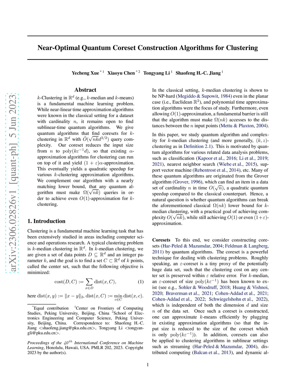 Near-Optimal Quantum Coreset Construction Algorithms for Clustering