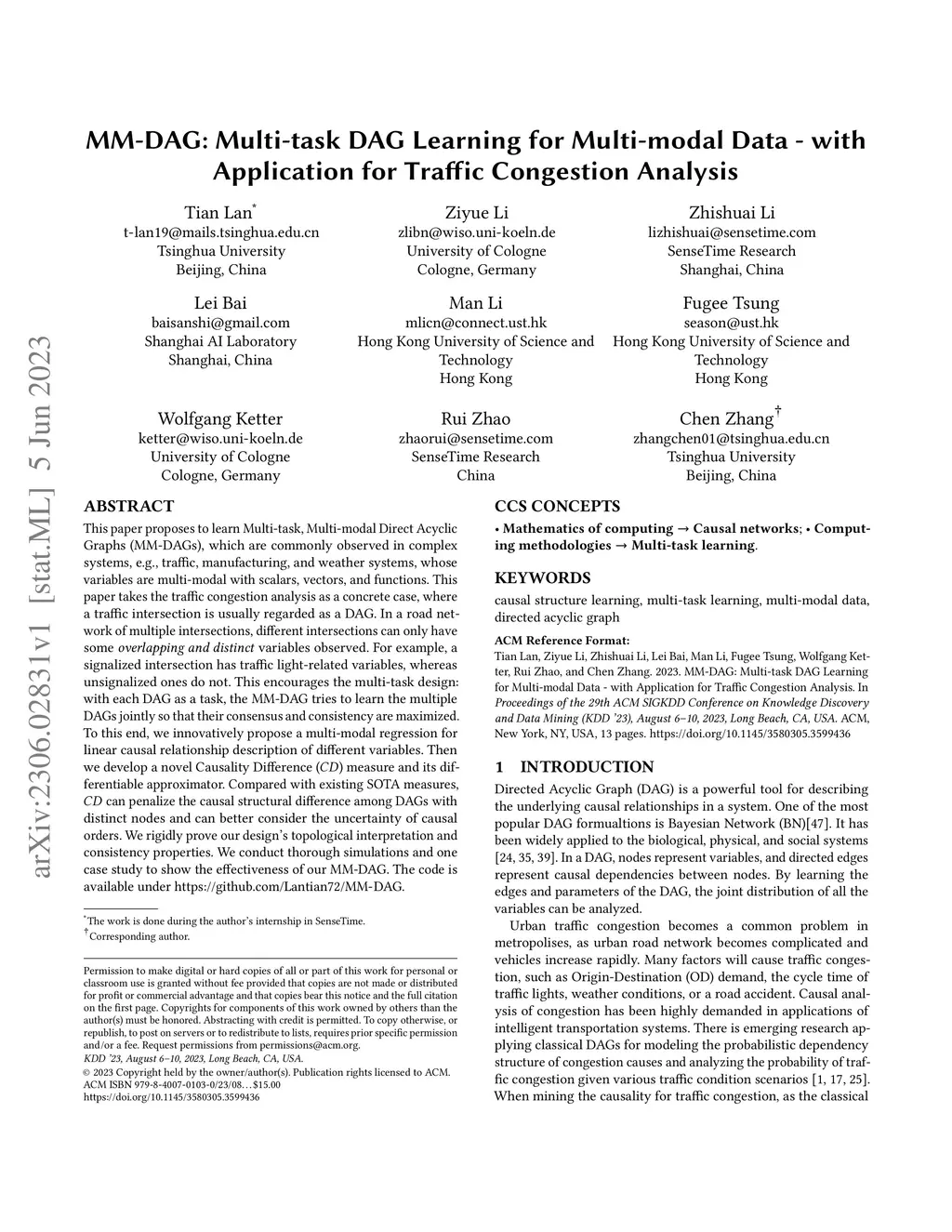 This paper proposes to learn Multi-task, Multi-modal Direct Acyclic Graphs (MM-DAGs), which are commonly observed in complex systems, e.g., traffic, manufacturing, and weather systems, whose variables are multi-modal with scalars, vectors, and functions. This paper takes the traffic congestion analysis as a concrete case, where a traffic intersection is usually regarded as a DAG. In a road network of multiple intersections, different intersections can only have some overlapping and distinct variables observed. For example, a signalized intersection has traffic light-related variables, whereas unsignalized ones do not. This encourages the multi-task design: with each DAG as a task, the MM-DAG tries to learn the multiple DAGs jointly so that their consensus and consistency are maximized. To this end, we innovatively propose a multi-modal regression for linear causal relationship description of different variables. Then we develop a novel Causality Difference (CD) measure and its differentiable approximator. Compared with existing SOTA measures, CD can penalize the causal structural difference among DAGs with distinct nodes and can better consider the uncertainty of causal orders. We rigidly prove our design's topological interpretation and consistency properties. We conduct thorough simulations and one case study to show the effectiveness of our MM-DAG. The code is available under https://github.com/Lantian72/MM-DAG