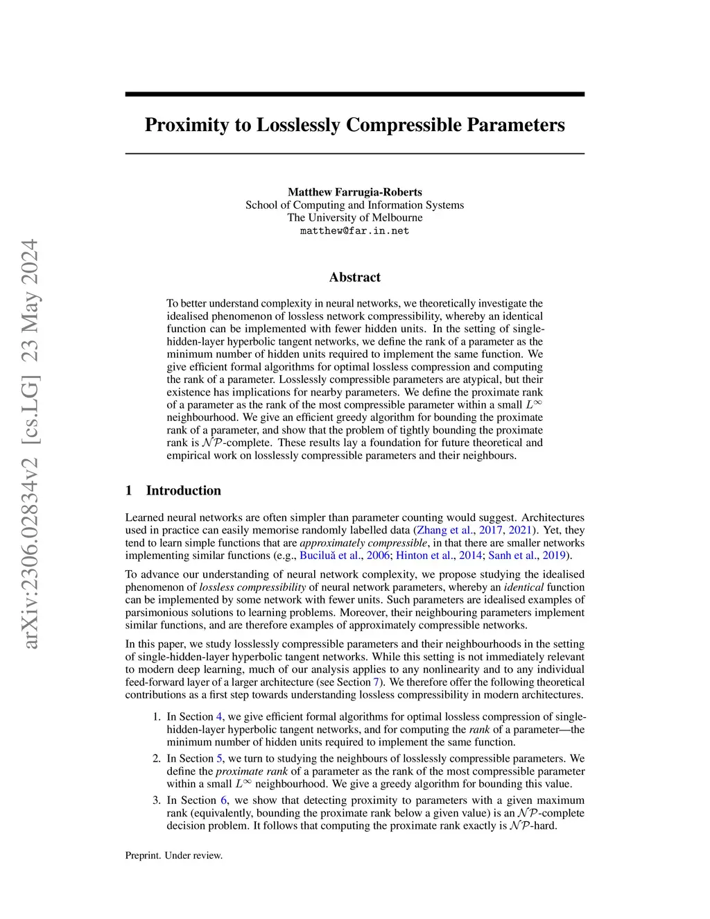 To better understand complexity in neural networks, we theoretically investigate the idealised phenomenon of lossless network compressibility, whereby an identical function can be implemented with fewer hidden units. In the setting of single-hidden-layer hyperbolic tangent networks, we define the rank of a parameter as the minimum number of hidden units required to implement the same function. We give efficient formal algorithms for optimal lossless compression and computing the rank of a parameter. Losslessly compressible parameters are atypical, but their existence has implications for nearby parameters. We define the proximate rank of a parameter as the rank of the most compressible parameter within a small L-infinity neighbourhood. We give an efficient greedy algorithm for bounding the proximate rank of a parameter, and show that the problem of tightly bounding the proximate rank is NP-complete. These results lay a foundation for future theoretical and empirical work on losslessly compressible parameters and their neighbours.