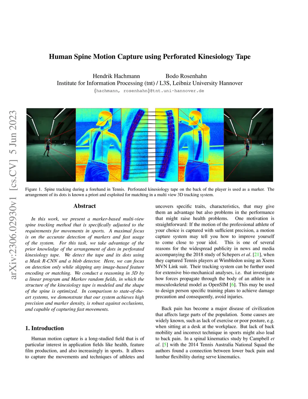 In this work, we present a marker-based multi-view spine tracking method that is specifically adjusted to the requirements for movements in sports. A maximal focus is on the accurate detection of markers and fast usage of the system. For this task, we take advantage of the prior knowledge of the arrangement of dots in perforated kinesiology tape. We detect the tape and its dots using a Mask R-CNN and a blob detector. Here, we can focus on detection only while skipping any image-based feature encoding or matching. We conduct a reasoning in 3D by a linear program and Markov random fields, in which the structure of the kinesiology tape is modeled and the shape of the spine is optimized. In comparison to state-of-the-art systems, we demonstrate that our system achieves high precision and marker density, is robust against occlusions, and capable of capturing fast movements.