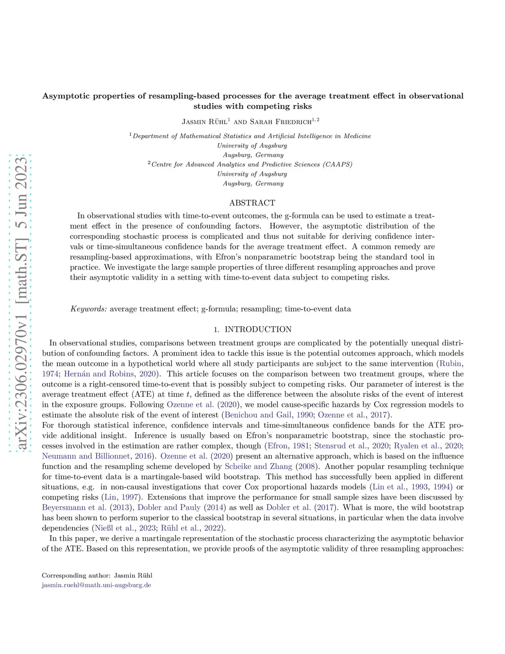 In observational studies with time-to-event outcomes, the g-formula can be used to estimate a treatment effect in the presence of confounding factors. However, the asymptotic distribution of the corresponding stochastic process is complicated and thus not suitable for deriving confidence intervals or time-simultaneous confidence bands for the average treatment effect. A common remedy are resampling-based approximations, with Efron's nonparametric bootstrap being the standard tool in practice. We investigate the large sample properties of three different resampling approaches and prove their asymptotic validity in a setting with time-to-event data subject to competing risks.