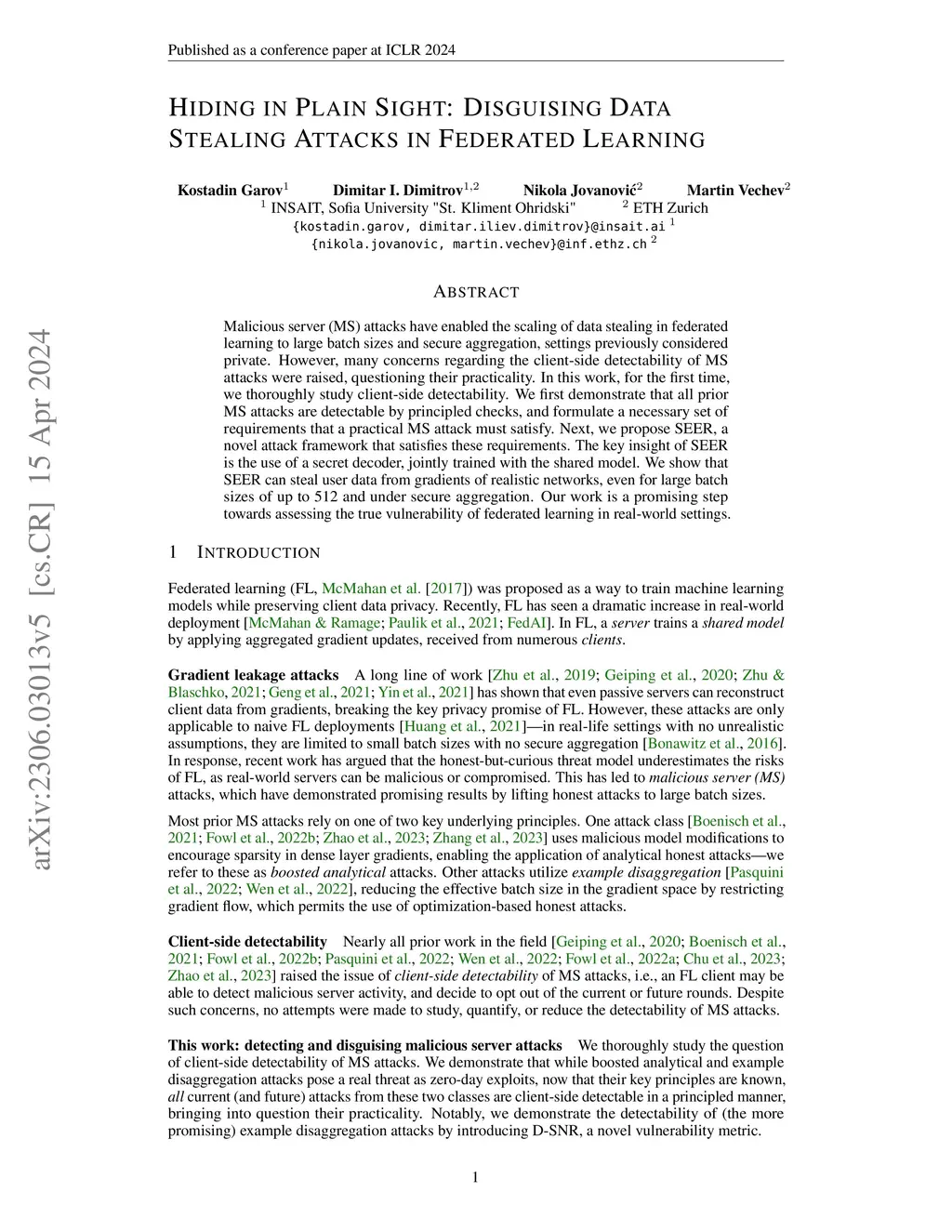 Malicious server (MS) attacks have enabled the scaling of data stealing in federated learning to large batch sizes and secure aggregation, settings previously considered private. However, many concerns regarding the client-side detectability of MS attacks were raised, questioning their practicality. In this work, for the first time, we thoroughly study client-side detectability. We first demonstrate that all prior MS attacks are detectable by principled checks, and formulate a necessary set of requirements that a practical MS attack must satisfy. Next, we propose SEER, a novel attack framework that satisfies these requirements. The key insight of SEER is the use of a secret decoder, jointly trained with the shared model. We show that SEER can steal user data from gradients of realistic networks, even for large batch sizes of up to 512 and under secure aggregation. Our work is a promising step towards assessing the true vulnerability of federated learning in real-world settings.