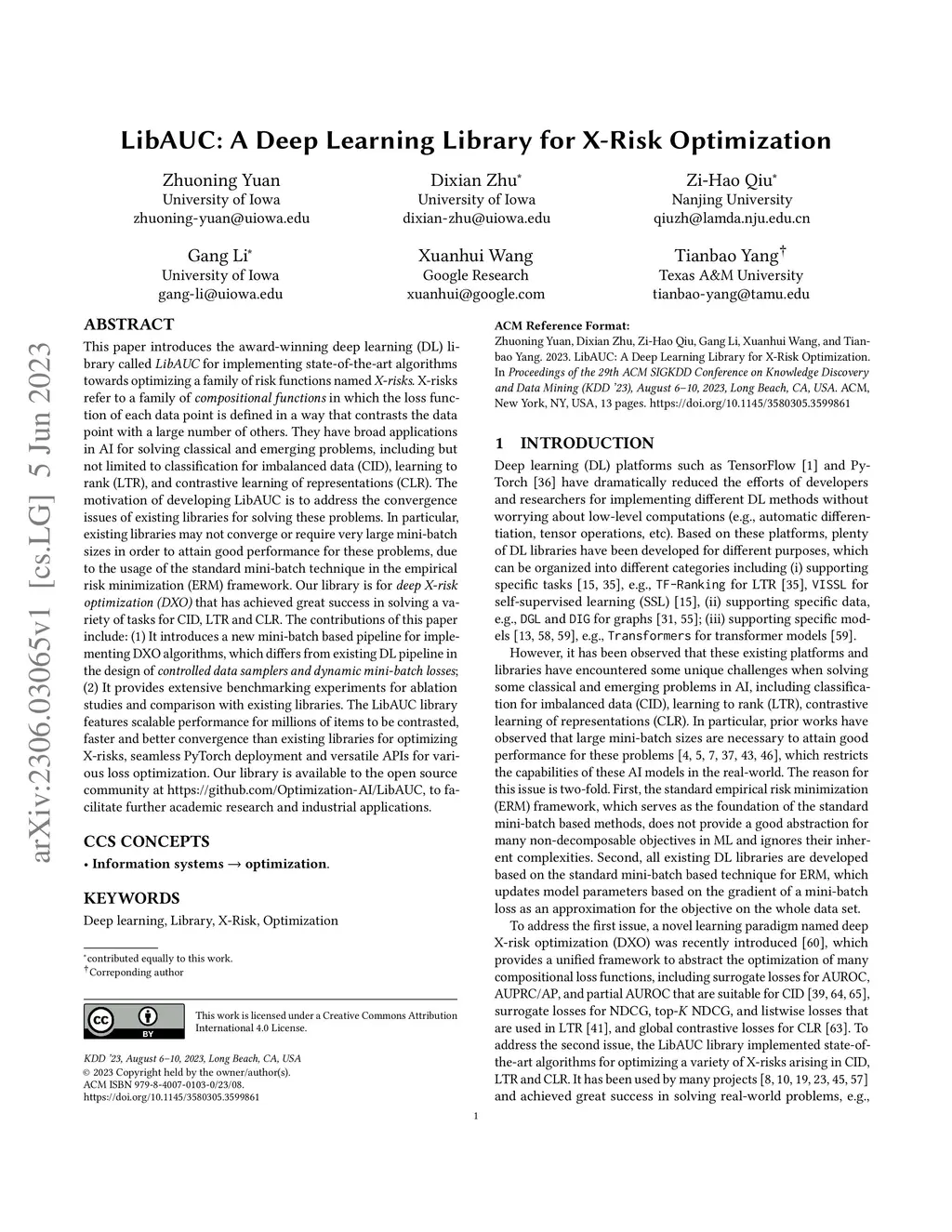 This paper introduces the award-winning deep learning (DL) library called LibAUC for implementing state-of-the-art algorithms towards optimizing a family of risk functions named X-risks. X-risks refer to a family of compositional functions in which the loss function of each data point is defined in a way that contrasts the data point with a large number of others. They have broad applications in AI for solving classical and emerging problems, including but not limited to classification for imbalanced data (CID), learning to rank (LTR), and contrastive learning of representations (CLR). The motivation of developing LibAUC is to address the convergence issues of existing libraries for solving these problems. In particular, existing libraries may not converge or require very large mini-batch sizes in order to attain good performance for these problems, due to the usage of the standard mini-batch technique in the empirical risk minimization (ERM) framework. Our library is for deep X-risk optimization (DXO) that has achieved great success in solving a variety of tasks for CID, LTR and CLR. The contributions of this paper include: (1) It introduces a new mini-batch based pipeline for implementing DXO algorithms, which differs from existing DL pipeline in the design of controlled data samplers and dynamic mini-batch losses; (2) It provides extensive benchmarking experiments for ablation studies and comparison with existing libraries. The LibAUC library features scalable performance for millions of items to be contrasted, faster and better convergence than existing libraries for optimizing X-risks, seamless PyTorch deployment and versatile APIs for various loss optimization. Our library is available to the open source community at https://github.com/Optimization-AI/LibAUC, to facilitate further academic research and industrial applications.