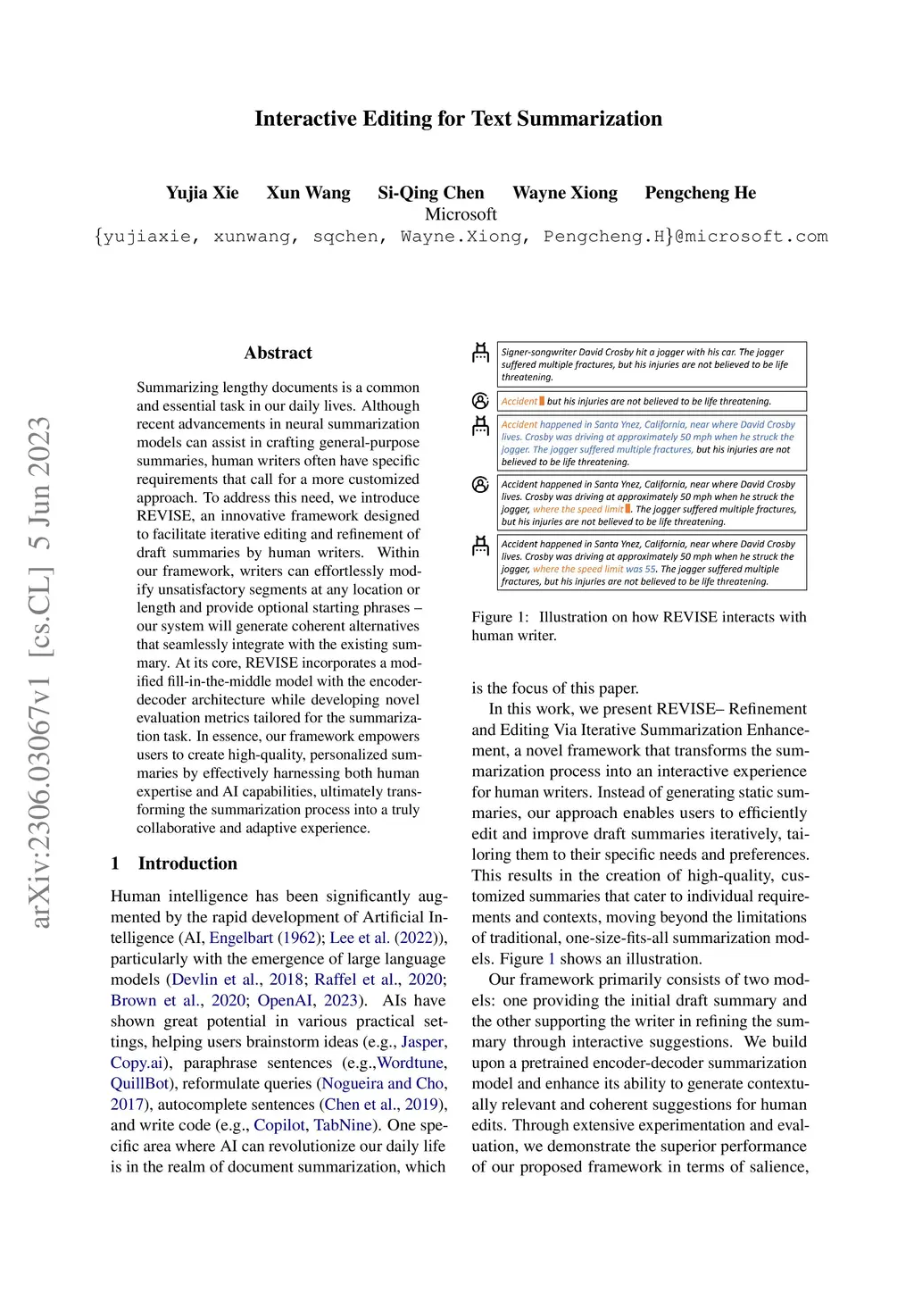 Summarizing lengthy documents is a common and essential task in our daily lives. Although recent advancements in neural summarization models can assist in crafting general-purpose summaries, human writers often have specific requirements that call for a more customized approach. To address this need, we introduce REVISE (Refinement and Editing via Iterative Summarization Enhancement), an innovative framework designed to facilitate iterative editing and refinement of draft summaries by human writers. Within our framework, writers can effortlessly modify unsatisfactory segments at any location or length and provide optional starting phrases -- our system will generate coherent alternatives that seamlessly integrate with the existing summary. At its core, REVISE incorporates a modified fill-in-the-middle model with the encoder-decoder architecture while developing novel evaluation metrics tailored for the summarization task. In essence, our framework empowers users to create high-quality, personalized summaries by effectively harnessing both human expertise and AI capabilities, ultimately transforming the summarization process into a truly collaborative and adaptive experience.