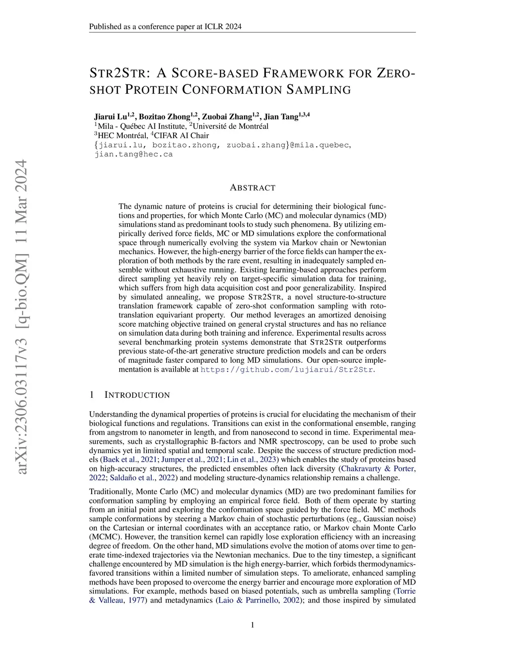 The dynamic nature of proteins is crucial for determining their biological functions and properties, for which Monte Carlo (MC) and molecular dynamics (MD) simulations stand as predominant tools to study such phenomena. By utilizing empirically derived force fields, MC or MD simulations explore the conformational space through numerically evolving the system via Markov chain or Newtonian mechanics. However, the high-energy barrier of the force fields can hamper the exploration of both methods by the rare event, resulting in inadequately sampled ensemble without exhaustive running. Existing learning-based approaches perform direct sampling yet heavily rely on target-specific simulation data for training, which suffers from high data acquisition cost and poor generalizability. Inspired by simulated annealing, we propose Str2Str, a novel structure-to-structure translation framework capable of zero-shot conformation sampling with roto-translation equivariant property. Our method leverages an amortized denoising score matching objective trained on general crystal structures and has no reliance on simulation data during both training and inference. Experimental results across several benchmarking protein systems demonstrate that Str2Str outperforms previous state-of-the-art generative structure prediction models and can be orders of magnitude faster compared to long MD simulations. Our open-source implementation is available at https://github.com/lujiarui/Str2Str