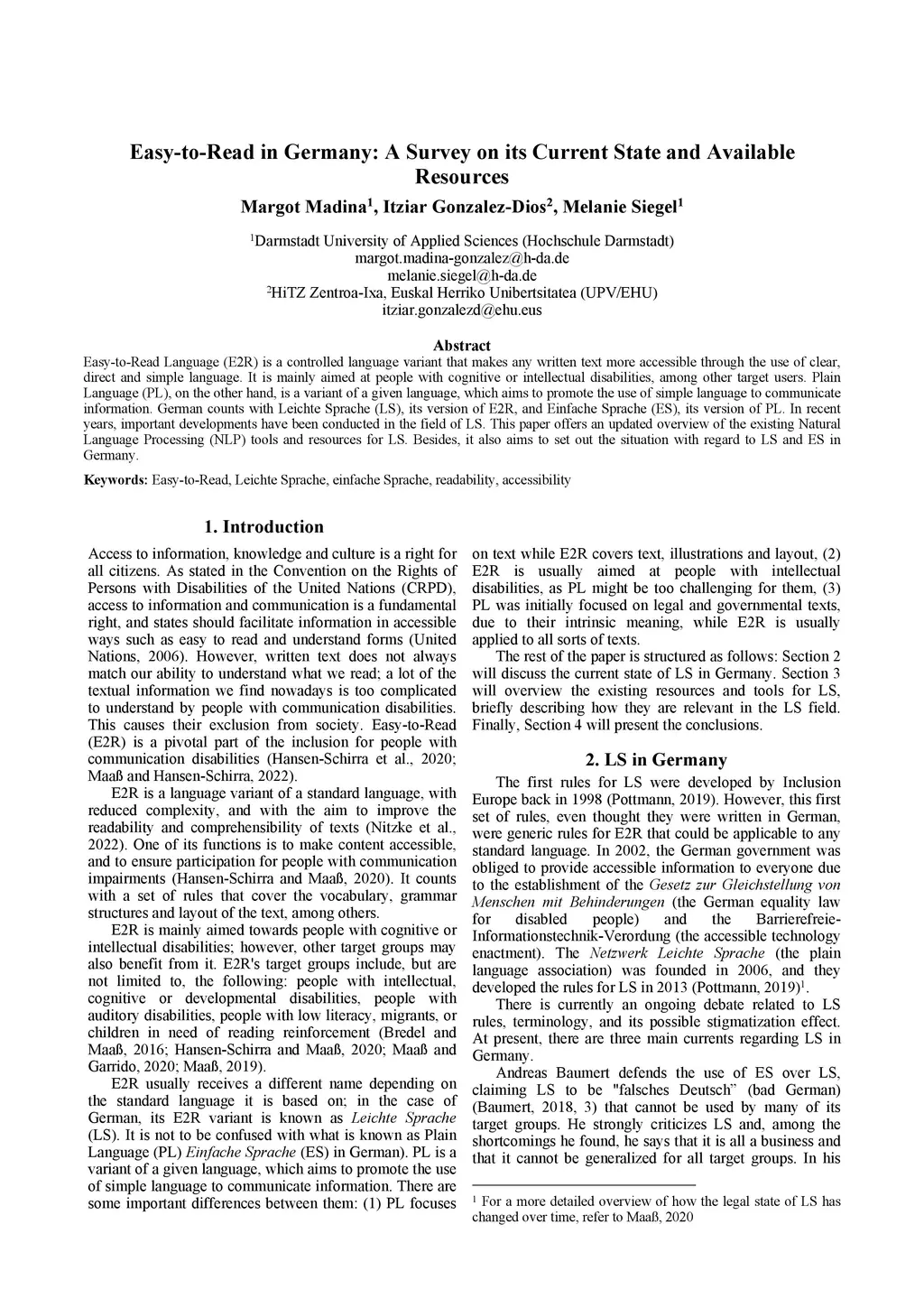 Easy-to-Read Language (E2R) is a controlled language variant that makes any written text more accessible through the use of clear, direct and simple language. It is mainly aimed at people with cognitive or intellectual disabilities, among other target users. Plain Language (PL), on the other hand, is a variant of a given language, which aims to promote the use of simple language to communicate information. German counts with Leichte Sprache (LS), its version of E2R, and Einfache Sprache (ES), its version of PL. In recent years, important developments have been conducted in the field of LS. This paper offers an updated overview of the existing Natural Language Processing (NLP) tools and resources for LS. Besides, it also aims to set out the situation with regard to LS and ES in Germany.