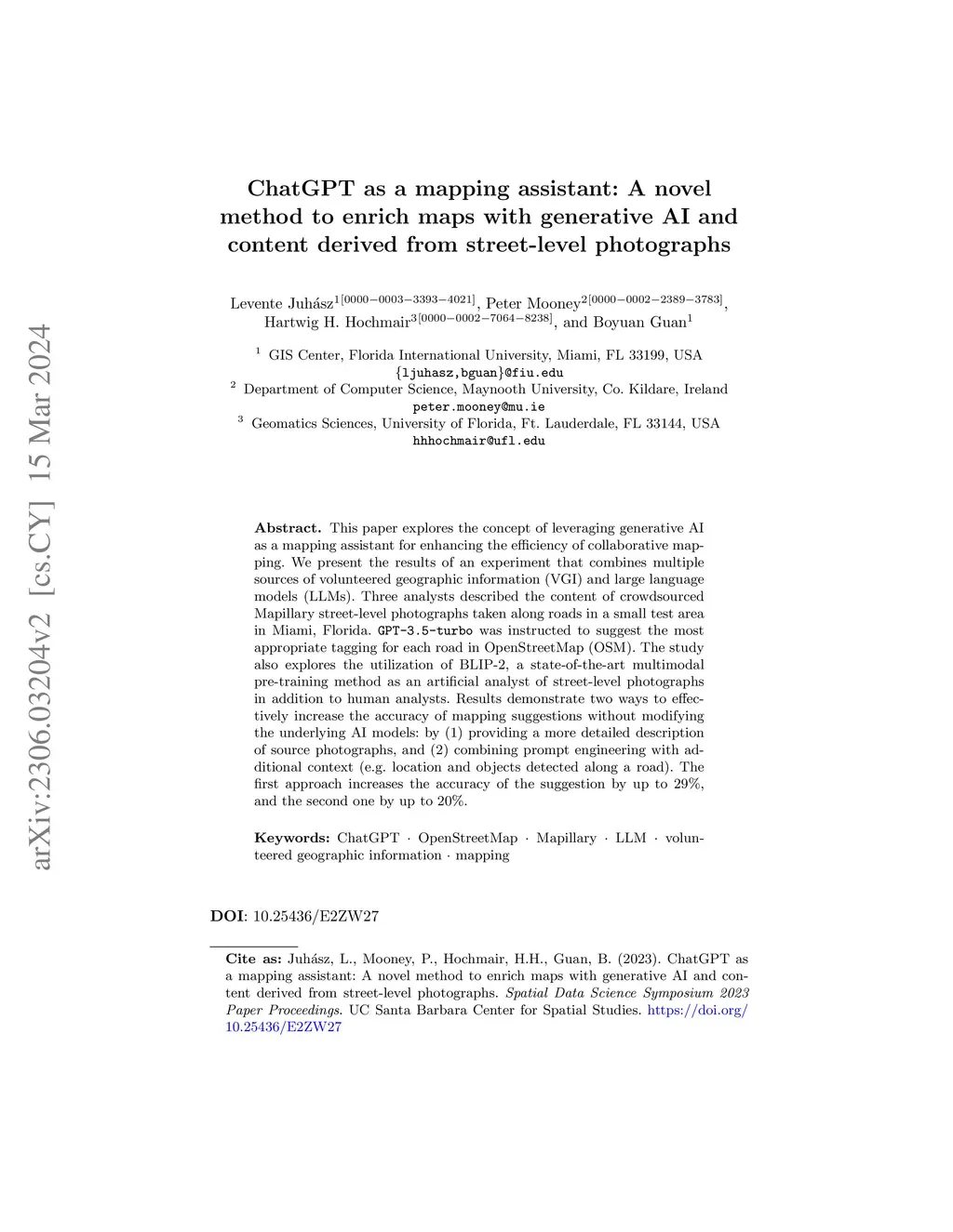 This paper explores the concept of leveraging generative AI as a mapping assistant for enhancing the efficiency of collaborative mapping. We present results of an experiment that combines multiple sources of volunteered geographic information (VGI) and large language models (LLMs). Three analysts described the content of crowdsourced Mapillary street-level photographs taken along roads in a small test area in Miami, Florida. GPT-3.5-turbo was instructed to suggest the most appropriate tagging for each road in OpenStreetMap (OSM). The study also explores the utilization of BLIP-2, a state-of-the-art multimodal pre-training method as an artificial analyst of street-level photographs in addition to human analysts. Results demonstrate two ways to effectively increase the accuracy of mapping suggestions without modifying the underlying AI models: by (1) providing a more detailed description of source photographs, and (2) combining prompt engineering with additional context (e.g. location and objects detected along a road). The first approach increases the suggestion accuracy by up to 29%, and the second one by up to 20%.