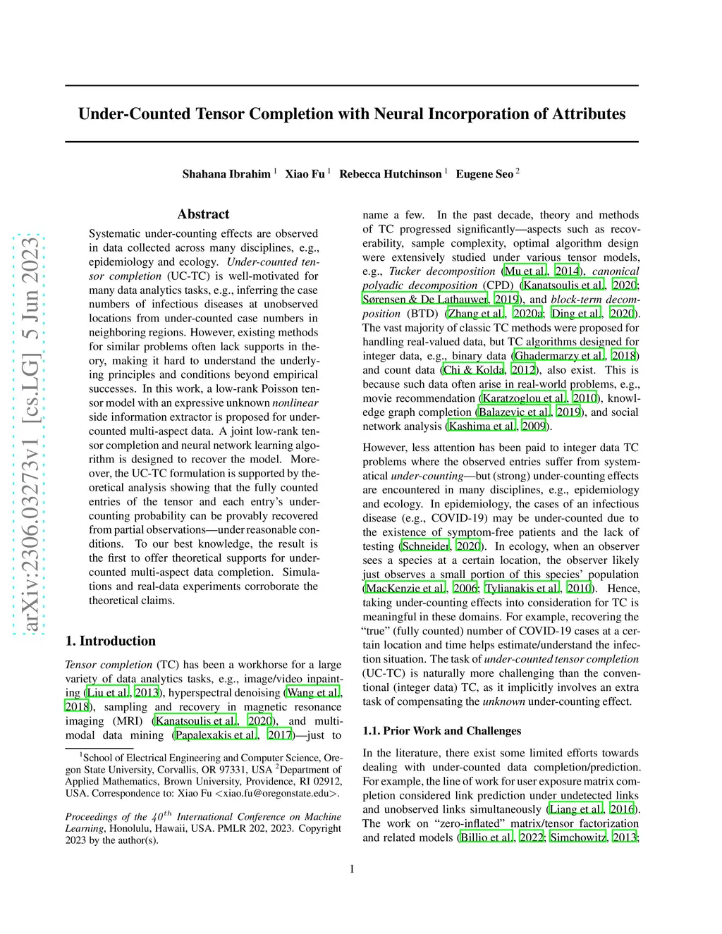 Systematic under-counting effects are observed in data collected across many disciplines, e.g., epidemiology and ecology. Under-counted tensor completion (UC-TC) is well-motivated for many data analytics tasks, e.g., inferring the case numbers of infectious diseases at unobserved locations from under-counted case numbers in neighboring regions. However, existing methods for similar problems often lack supports in theory, making it hard to understand the underlying principles and conditions beyond empirical successes. In this work, a low-rank Poisson tensor model with an expressive unknown nonlinear side information extractor is proposed for under-counted multi-aspect data. A joint low-rank tensor completion and neural network learning algorithm is designed to recover the model. Moreover, the UC-TC formulation is supported by theoretical analysis showing that the fully counted entries of the tensor and each entry's under-counting probability can be provably recovered from partial observations -- under reasonable conditions. To our best knowledge, the result is the first to offer theoretical supports for under-counted multi-aspect data completion. Simulations and real-data experiments corroborate the theoretical claims.
