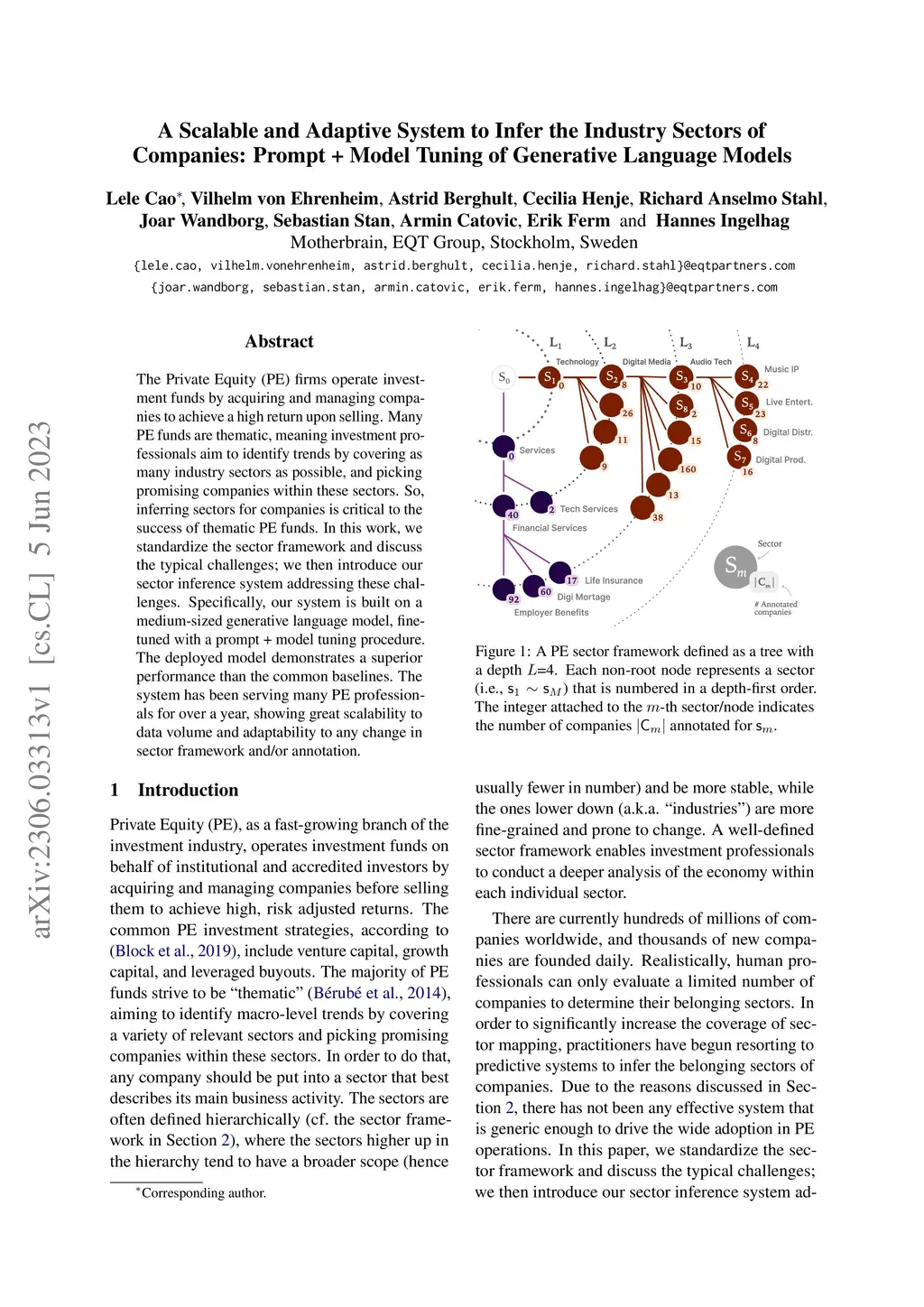 The Private Equity (PE) firms operate investment funds by acquiring and managing companies to achieve a high return upon selling. Many PE funds are thematic, meaning investment professionals aim to identify trends by covering as many industry sectors as possible, and picking promising companies within these sectors. So, inferring sectors for companies is critical to the success of thematic PE funds. In this work, we standardize the sector framework and discuss the typical challenges; we then introduce our sector inference system addressing these challenges. Specifically, our system is built on a medium-sized generative language model, finetuned with a prompt + model tuning procedure. The deployed model demonstrates a superior performance than the common baselines. The system has been serving many PE professionals for over a year, showing great scalability to data volume and adaptability to any change in sector framework and/or annotation.