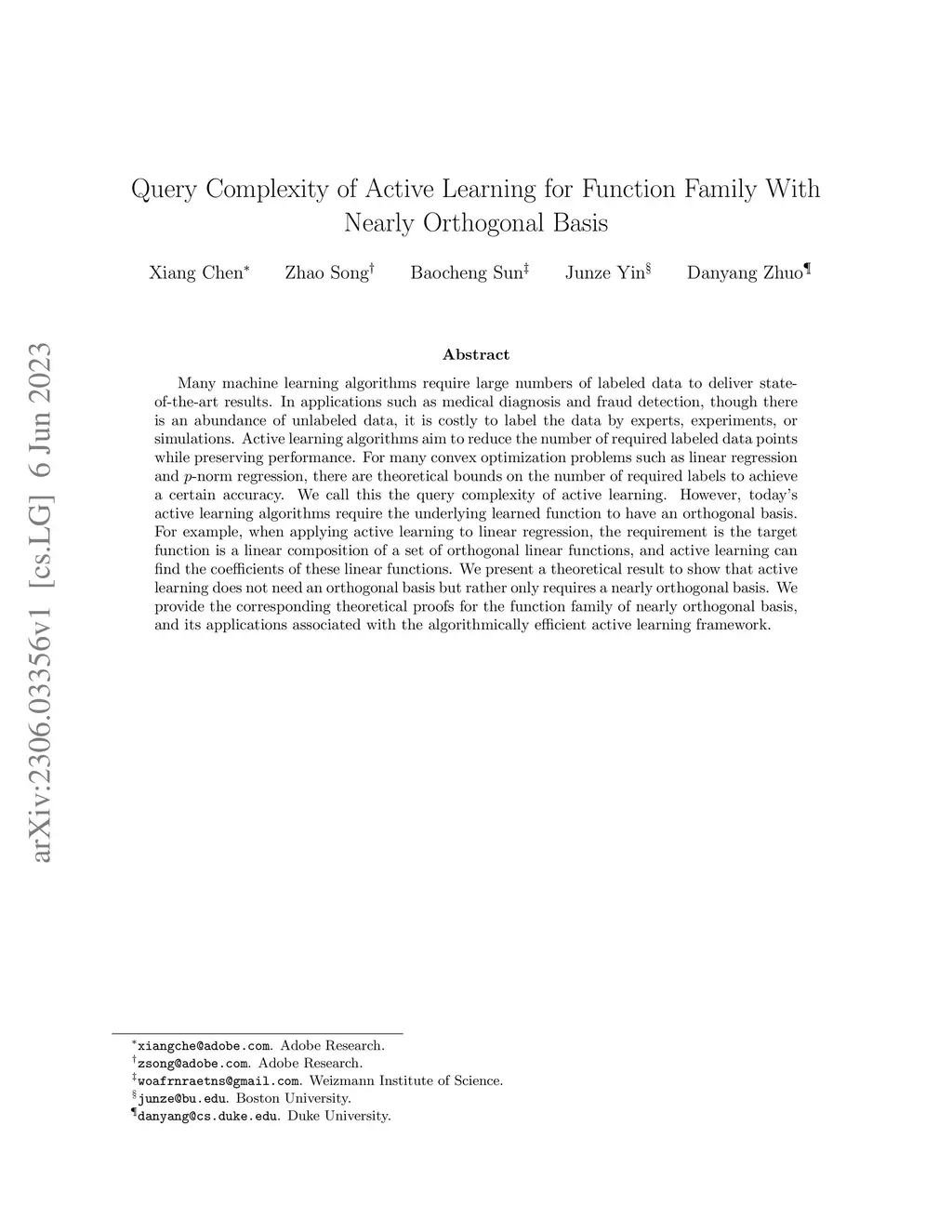 Many machine learning algorithms require large numbers of labeled data to deliver state-of-the-art results. In applications such as medical diagnosis and fraud detection, though there is an abundance of unlabeled data, it is costly to label the data by experts, experiments, or simulations. Active learning algorithms aim to reduce the number of required labeled data points while preserving performance. For many convex optimization problems such as linear regression and -norm regression, there are theoretical bounds on the number of required labels to achieve a certain accuracy. We call this the query complexity of active learning. However, today's active learning algorithms require the underlying learned function to have an orthogonal basis. For example, when applying active learning to linear regression, the requirement is the target function is a linear composition of a set of orthogonal linear functions, and active learning can find the coefficients of these linear functions. We present a theoretical result to show that active learning does not need an orthogonal basis but rather only requires a nearly orthogonal basis. We provide the corresponding theoretical proofs for the function family of nearly orthogonal basis, and its applications associated with the algorithmically efficient active learning framework.