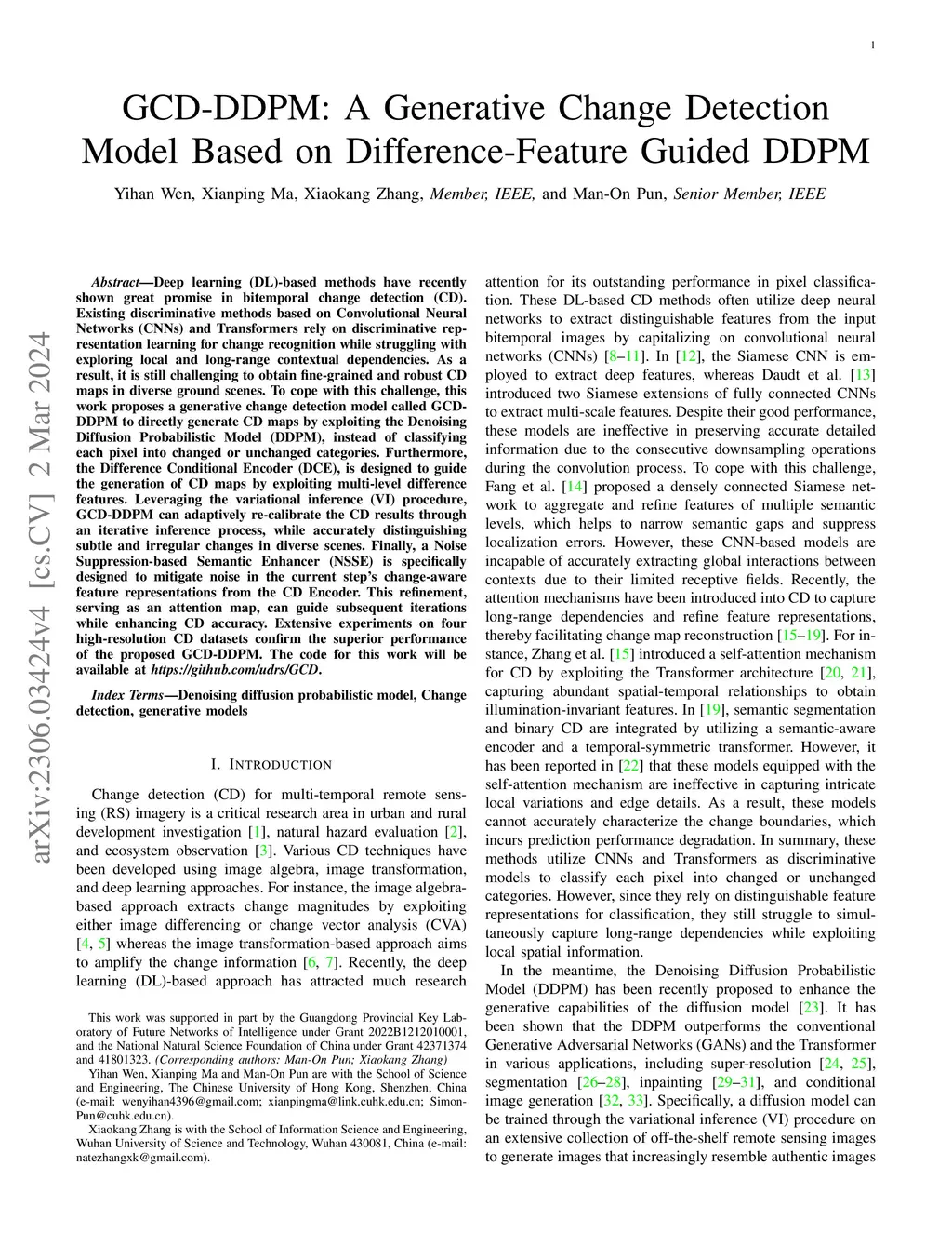 Deep learning (DL)-based methods have recently shown great promise in bitemporal change detection (CD). Existing discriminative methods based on Convolutional Neural Networks (CNNs) and Transformers rely on discriminative representation learning for change recognition while struggling with exploring local and long-range contextual dependencies. As a result, it is still challenging to obtain fine-grained and robust CD maps in diverse ground scenes. To cope with this challenge, this work proposes a generative change detection model called GCD-DDPM to directly generate CD maps by exploiting the Denoising Diffusion Probabilistic Model (DDPM), instead of classifying each pixel into changed or unchanged categories. Furthermore, the Difference Conditional Encoder (DCE), is designed to guide the generation of CD maps by exploiting multi-level difference features. Leveraging the variational inference (VI) procedure, GCD-DDPM can adaptively re-calibrate the CD results through an iterative inference process, while accurately distinguishing subtle and irregular changes in diverse scenes. Finally, a Noise Suppression-based Semantic Enhancer (NSSE) is specifically designed to mitigate noise in the current step's change-aware feature representations from the CD Encoder. This refinement, serving as an attention map, can guide subsequent iterations while enhancing CD accuracy. Extensive experiments on four high-resolution CD datasets confirm the superior performance of the proposed GCD-DDPM. The code for this work will be available at https://github.com/udrs/GCD.