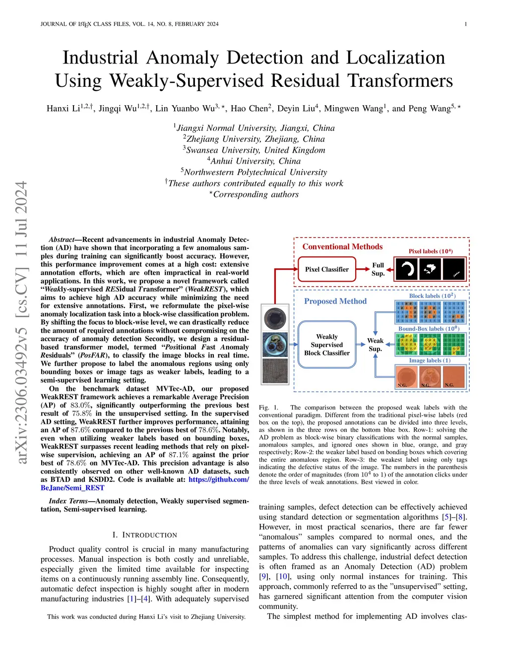 Recent advancements in industrial Anomaly Detection (AD) have shown that incorporating a few anomalous samples during training can significantly boost accuracy. However, this performance improvement comes at a high cost: extensive annotation efforts, which are often impractical in real-world applications. In this work, we propose a novel framework called "Weakly-supervised RESidual Transformer" (WeakREST), which aims to achieve high AD accuracy while minimizing the need for extensive annotations. First, we reformulate the pixel-wise anomaly localization task into a block-wise classification problem. By shifting the focus to block-wise level, we can drastically reduce the amount of required annotations without compromising on the accuracy of anomaly detection Secondly, we design a residual-based transformer model, termed "Positional Fast Anomaly Residuals" (PosFAR), to classify the image blocks in real time. We further propose to label the anomalous regions using only bounding boxes or image tags as weaker labels, leading to a semi-supervised learning setting. On the benchmark dataset MVTec-AD, our proposed WeakREST framework achieves a remarkable Average Precision (AP) of 83.0%, significantly outperforming the previous best result of 75.8% in the unsupervised setting. In the supervised AD setting, WeakREST further improves performance, attaining an AP of 87.6% compared to the previous best of 78.6%. Notably, even when utilizing weaker labels based on bounding boxes, WeakREST surpasses recent leading methods that rely on pixel-wise supervision, achieving an AP of 87.1% against the prior best of 78.6% on MVTec-AD. This precision advantage is also consistently observed on other well-known AD datasets, such as BTAD and KSDD2.