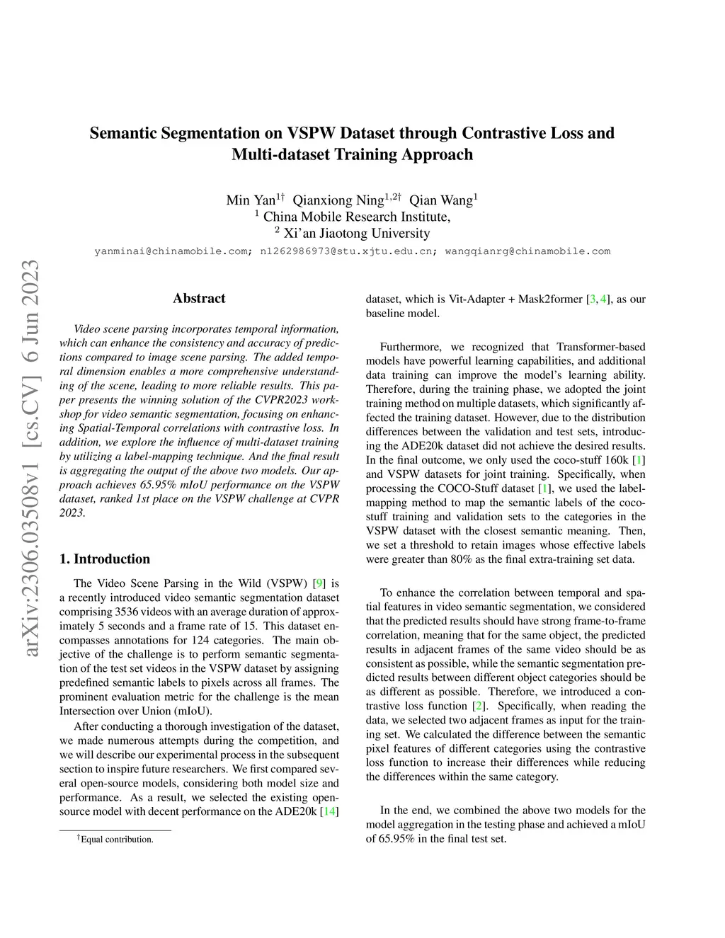 Semantic Segmentation on VSPW Dataset through Contrastive Loss and