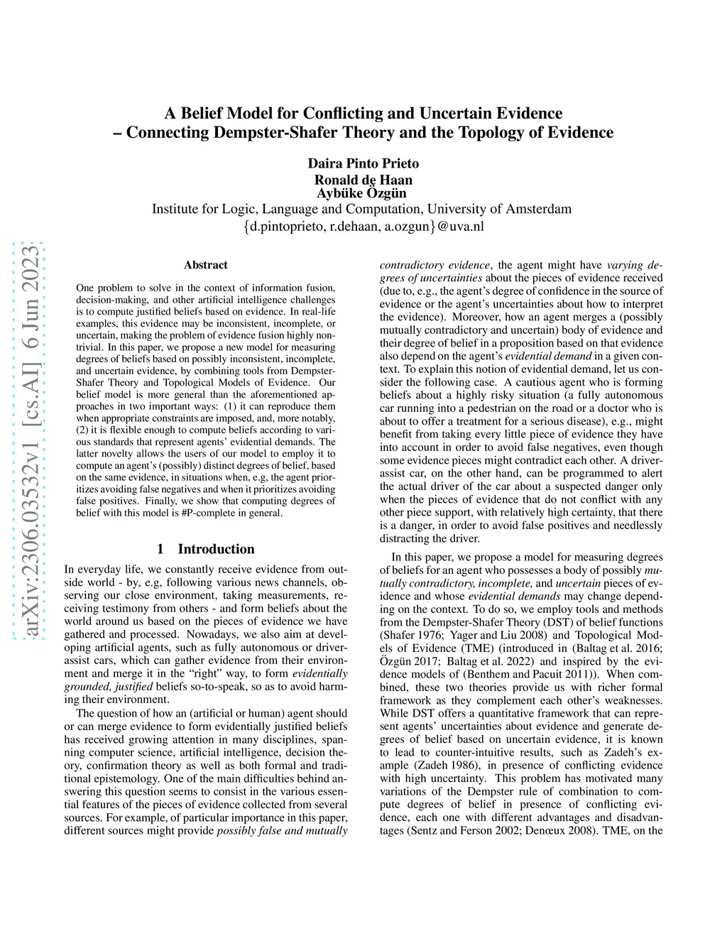 A Belief Model for Conflicting and Uncertain Evidence -- Connecting