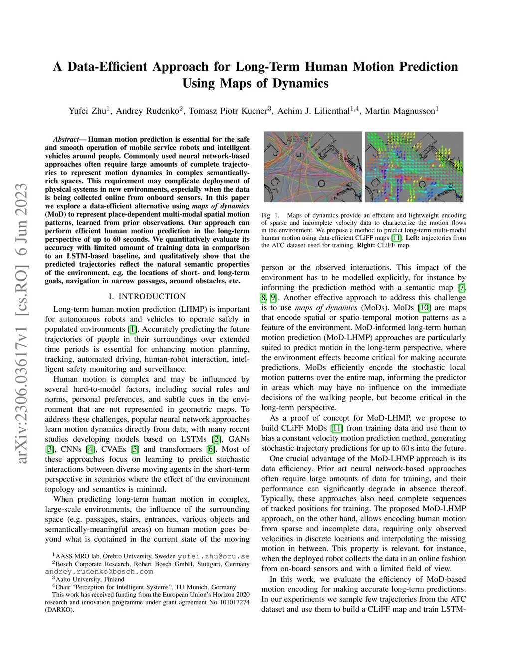 Human motion prediction is essential for the safe and smooth operation of mobile service robots and intelligent vehicles around people. Commonly used neural network-based approaches often require large amounts of complete trajectories to represent motion dynamics in complex semantically-rich spaces. This requirement may complicate deployment of physical systems in new environments, especially when the data is being collected online from onboard sensors. In this paper we explore a data-efficient alternative using maps of dynamics (MoD) to represent place-dependent multi-modal spatial motion patterns, learned from prior observations. Our approach can perform efficient human motion prediction in the long-term perspective of up to 60 seconds. We quantitatively evaluate its accuracy with limited amount of training data in comparison to an LSTM-based baseline, and qualitatively show that the predicted trajectories reflect the natural semantic properties of the environment, e.g. the locations of short- and long-term goals, navigation in narrow passages, around obstacles, etc.