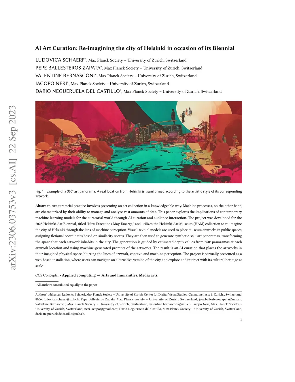 Art curatorial practice is characterized by the presentation of an art collection in a knowledgeable way. Machine processes are characterized by their capacity to manage and analyze large amounts of data. This paper envisages AI curation and audience interaction to explore the implications of contemporary machine learning models for the curatorial world. This project was developed for the occasion of the 2023 Helsinki Art Biennial, entitled New Directions May Emerge. We use the Helsinki Art Museum (HAM) collection to re-imagine the city of Helsinki through the lens of machine perception. We use visual-textual models to place indoor artworks in public spaces, assigning fictional coordinates based on similarity scores. We transform the space that each artwork inhabits in the city by generating synthetic 360 art panoramas. We guide the generation estimating depth values from 360 panoramas at each artwork location, and machine-generated prompts of the artworks. The result of this project is an AI curation that places the artworks in their imagined physical space, blurring the lines of artwork, context, and machine perception. The work is virtually presented as a web-based installation on this link http://newlyformedcity.net/, where users can navigate an alternative version of the city while exploring and interacting with its cultural heritage at scale.