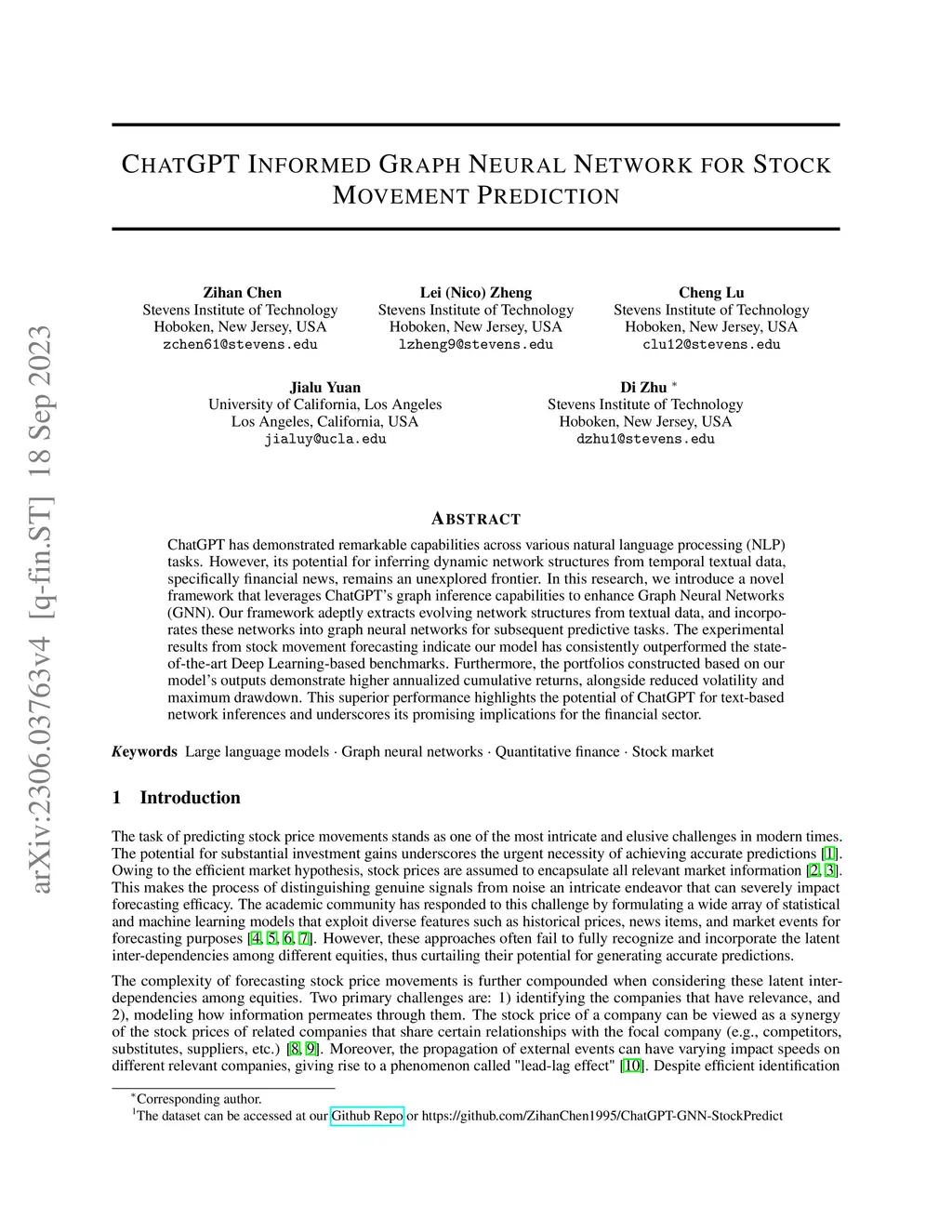 ChatGPT has demonstrated remarkable capabilities across various natural language processing (NLP) tasks. However, its potential for inferring dynamic network structures from temporal textual data, specifically financial news, remains an unexplored frontier. In this research, we introduce a novel framework that leverages ChatGPT's graph inference capabilities to enhance Graph Neural Networks (GNN). Our framework adeptly extracts evolving network structures from textual data, and incorporates these networks into graph neural networks for subsequent predictive tasks. The experimental results from stock movement forecasting indicate our model has consistently outperformed the state-of-the-art Deep Learning-based benchmarks. Furthermore, the portfolios constructed based on our model's outputs demonstrate higher annualized cumulative returns, alongside reduced volatility and maximum drawdown. This superior performance highlights the potential of ChatGPT for text-based network inferences and underscores its promising implications for the financial sector.