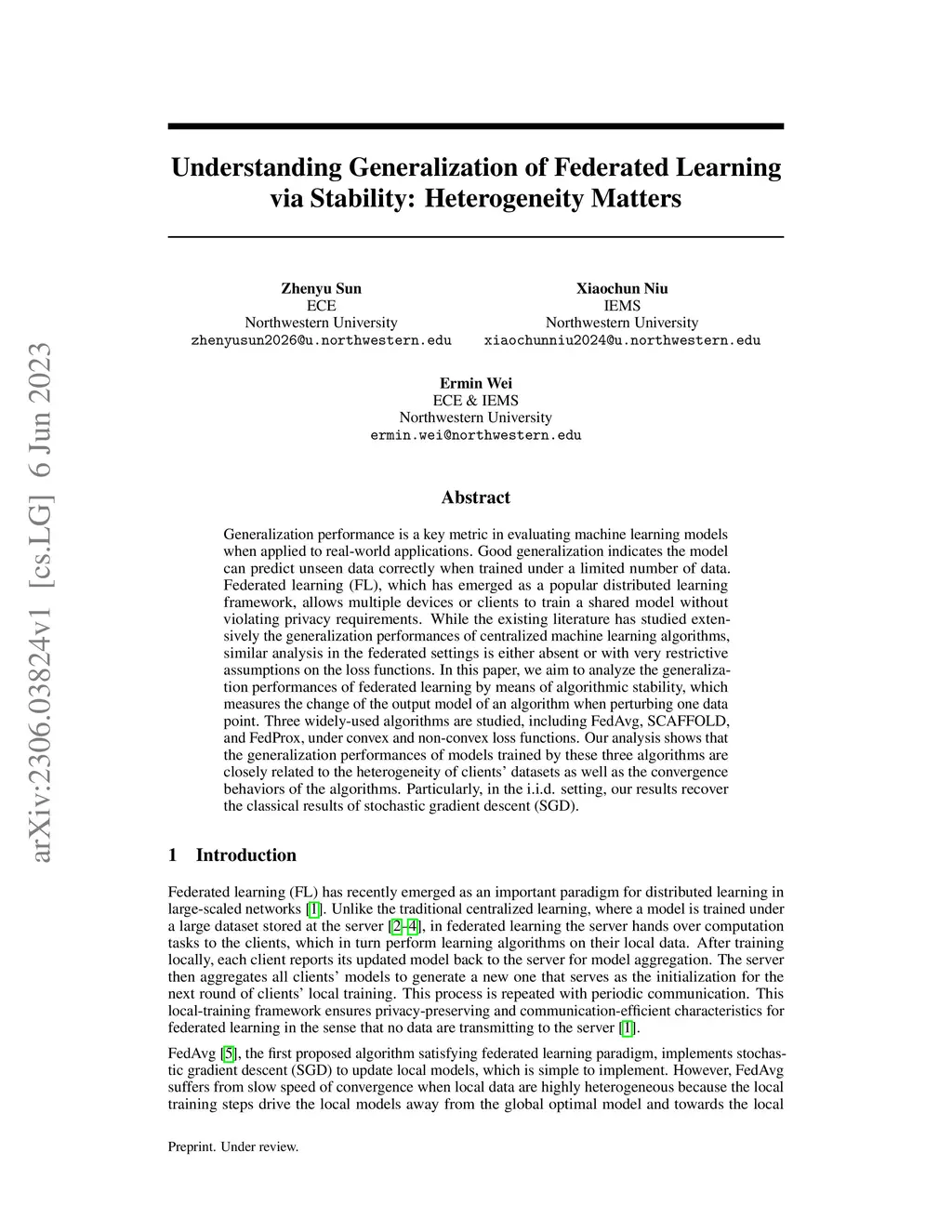 Generalization performance is a key metric in evaluating machine learning models when applied to real-world applications. Good generalization indicates the model can predict unseen data correctly when trained under a limited number of data. Federated learning (FL), which has emerged as a popular distributed learning framework, allows multiple devices or clients to train a shared model without violating privacy requirements. While the existing literature has studied extensively the generalization performances of centralized machine learning algorithms, similar analysis in the federated settings is either absent or with very restrictive assumptions on the loss functions. In this paper, we aim to analyze the generalization performances of federated learning by means of algorithmic stability, which measures the change of the output model of an algorithm when perturbing one data point. Three widely-used algorithms are studied, including FedAvg, SCAFFOLD, and FedProx, under convex and non-convex loss functions. Our analysis shows that the generalization performances of models trained by these three algorithms are closely related to the heterogeneity of clients' datasets as well as the convergence behaviors of the algorithms. Particularly, in the i.i.d. setting, our results recover the classical results of stochastic gradient descent (SGD).