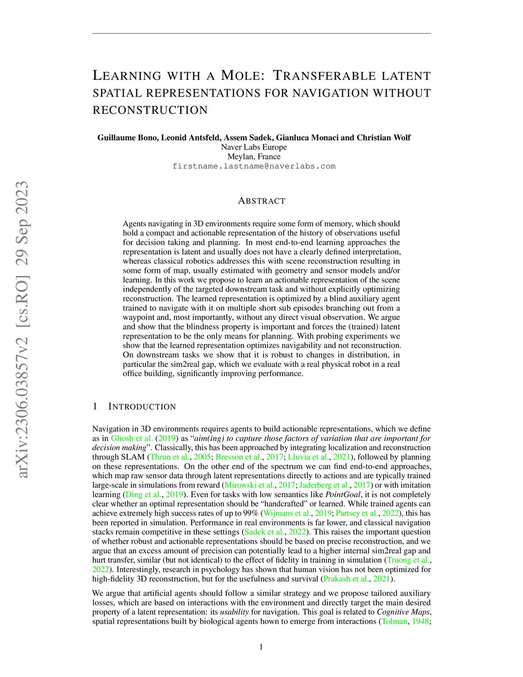 Agents navigating in 3D environments require some form of memory, which should hold a compact and actionable representation of the history of observations useful for decision taking and planning. In most end-to-end learning approaches the representation is latent and usually does not have a clearly defined interpretation, whereas classical robotics addresses this with scene reconstruction resulting in some form of map, usually estimated with geometry and sensor models and/or learning. In this work we propose to learn an actionable representation of the scene independently of the targeted downstream task and without explicitly optimizing reconstruction. The learned representation is optimized by a blind auxiliary agent trained to navigate with it on multiple short sub episodes branching out from a waypoint and, most importantly, without any direct visual observation. We argue and show that the blindness property is important and forces the (trained) latent representation to be the only means for planning. With probing experiments we show that the learned representation optimizes navigability and not reconstruction. On downstream tasks we show that it is robust to changes in distribution, in particular the sim2real gap, which we evaluate with a real physical robot in a real office building, significantly improving performance.