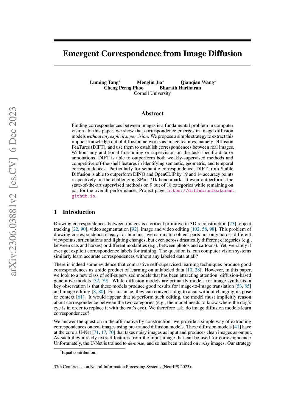Finding correspondences between images is a fundamental problem in computer vision. In this paper, we show that correspondence emerges in image diffusion models without any explicit supervision. We propose a simple strategy to extract this implicit knowledge out of diffusion networks as image features, namely DIffusion FeaTures (DIFT), and use them to establish correspondences between real images. Without any additional fine-tuning or supervision on the task-specific data or annotations, DIFT is able to outperform both weakly-supervised methods and competitive off-the-shelf features in identifying semantic, geometric, and temporal correspondences. Particularly for semantic correspondence, DIFT from Stable Diffusion is able to outperform DINO and OpenCLIP by 19 and 14 accuracy points respectively on the challenging SPair-71k benchmark. It even outperforms the state-of-the-art supervised methods on 9 out of 18 categories while remaining on par for the overall performance. Project page: https://diffusionfeatures.github.io