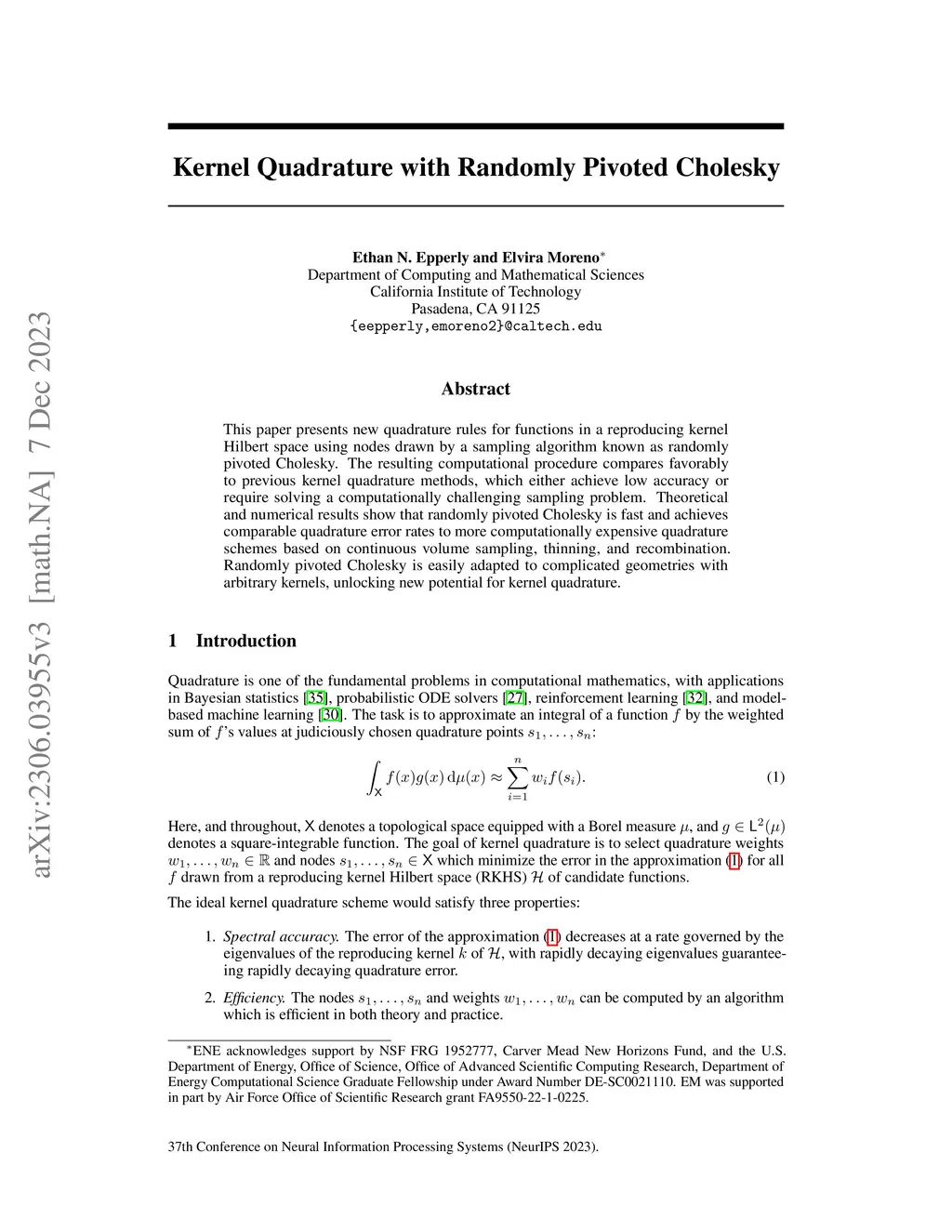 This paper presents new quadrature rules for functions in a reproducing kernel Hilbert space using nodes drawn by a sampling algorithm known as randomly pivoted Cholesky. The resulting computational procedure compares favorably to previous kernel quadrature methods, which either achieve low accuracy or require solving a computationally challenging sampling problem. Theoretical and numerical results show that randomly pivoted Cholesky is fast and achieves comparable quadrature error rates to more computationally expensive quadrature schemes based on continuous volume sampling, thinning, and recombination. Randomly pivoted Cholesky is easily adapted to complicated geometries with arbitrary kernels, unlocking new potential for kernel quadrature.
