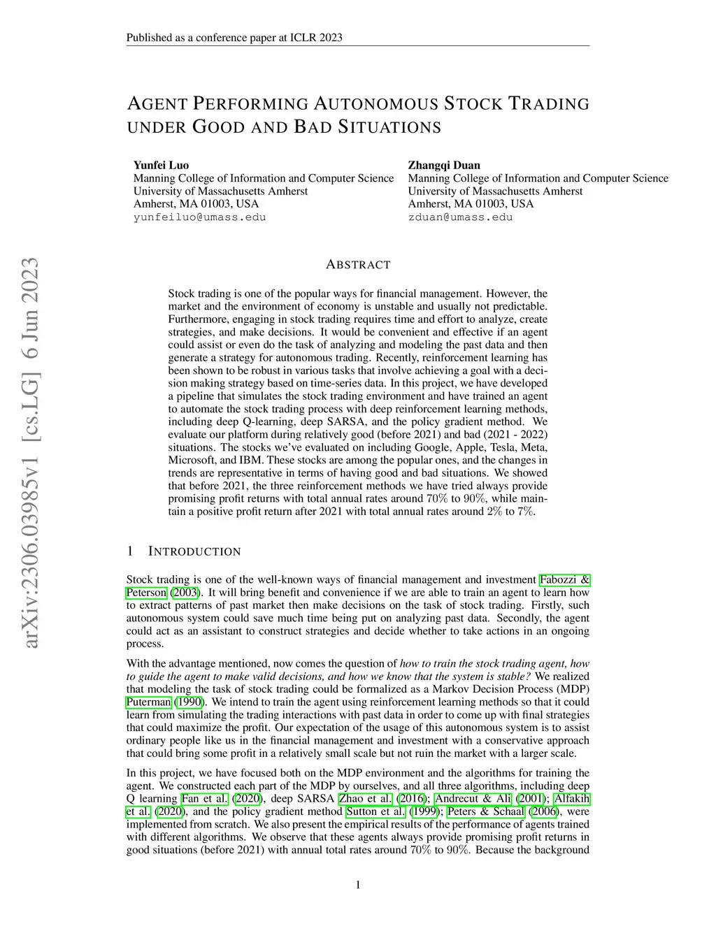 Agent Performing Autonomous Stock Trading under Good and Bad Situations