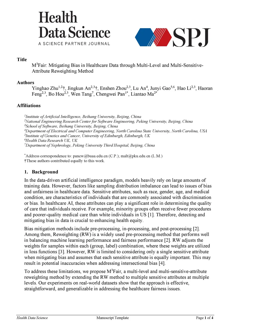 In the data-driven artificial intelligence paradigm, models heavily rely on large amounts of training data. However, factors like sampling distribution imbalance can lead to issues of bias and unfairness in healthcare data. Sensitive attributes, such as race, gender, age, and medical condition, are characteristics of individuals that are commonly associated with discrimination or bias. In healthcare AI, these attributes can play a significant role in determining the quality of care that individuals receive. For example, minority groups often receive fewer procedures and poorer-quality medical care than white individuals in US. Therefore, detecting and mitigating bias in data is crucial to enhancing health equity. Bias mitigation methods include pre-processing, in-processing, and post-processing. Among them, Reweighting (RW) is a widely used pre-processing method that performs well in balancing machine learning performance and fairness performance. RW adjusts the weights for samples within each (group, label) combination, where these weights are utilized in loss functions. However, RW is limited to considering only a single sensitive attribute when mitigating bias and assumes that each sensitive attribute is equally important. This may result in potential inaccuracies when addressing intersectional bias. To address these limitations, we propose M3Fair, a multi-level and multi-sensitive-attribute reweighting method by extending the RW method to multiple sensitive attributes at multiple levels. Our experiments on real-world datasets show that the approach is effective, straightforward, and generalizable in addressing the healthcare fairness issues.