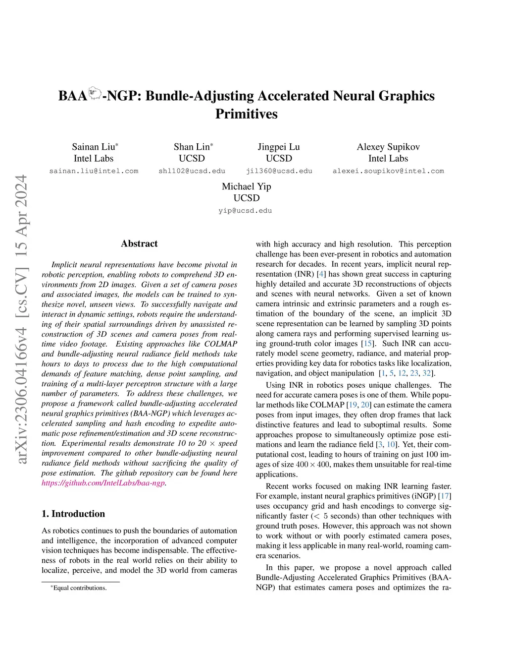 Implicit neural representations have become pivotal in robotic perception, enabling robots to comprehend 3D environments from 2D images. Given a set of camera poses and associated images, the models can be trained to synthesize novel, unseen views. To successfully navigate and interact in dynamic settings, robots require the understanding of their spatial surroundings driven by unassisted reconstruction of 3D scenes and camera poses from real-time video footage. Existing approaches like COLMAP and bundle-adjusting neural radiance field methods take hours to days to process due to the high computational demands of feature matching, dense point sampling, and training of a multi-layer perceptron structure with a large number of parameters. To address these challenges, we propose a framework called bundle-adjusting accelerated neural graphics primitives (BAA-NGP) which leverages accelerated sampling and hash encoding to expedite automatic pose refinement/estimation and 3D scene reconstruction. Experimental results demonstrate 10 to 20 x speed improvement compared to other bundle-adjusting neural radiance field methods without sacrificing the quality of pose estimation. The github repository can be found here https://github.com/IntelLabs/baa-ngp.