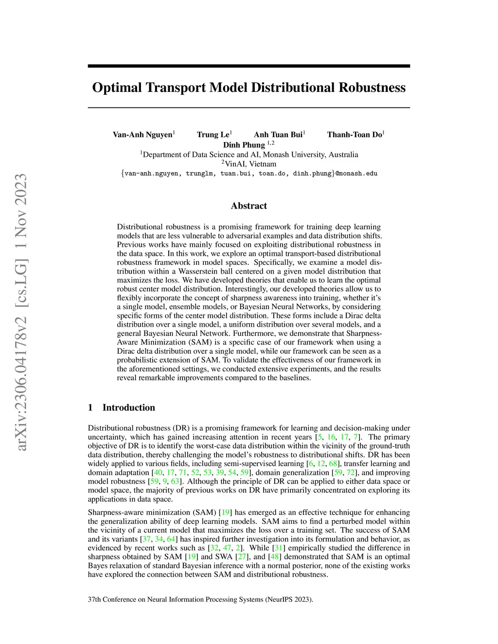 Distributional robustness is a promising framework for training deep learning models that are less vulnerable to adversarial examples and data distribution shifts. Previous works have mainly focused on exploiting distributional robustness in data space. In this work, we explore an optimal transport-based distributional robustness framework on model spaces. Specifically, we examine a model distribution in a Wasserstein ball of a given center model distribution that maximizes the loss. We have developed theories that allow us to learn the optimal robust center model distribution. Interestingly, through our developed theories, we can flexibly incorporate the concept of sharpness awareness into training a single model, ensemble models, and Bayesian Neural Networks by considering specific forms of the center model distribution, such as a Dirac delta distribution over a single model, a uniform distribution over several models, and a general Bayesian Neural Network. Furthermore, we demonstrate that sharpness-aware minimization (SAM) is a specific case of our framework when using a Dirac delta distribution over a single model, while our framework can be viewed as a probabilistic extension of SAM. We conduct extensive experiments to demonstrate the usefulness of our framework in the aforementioned settings, and the results show remarkable improvements in our approaches to the baselines.
