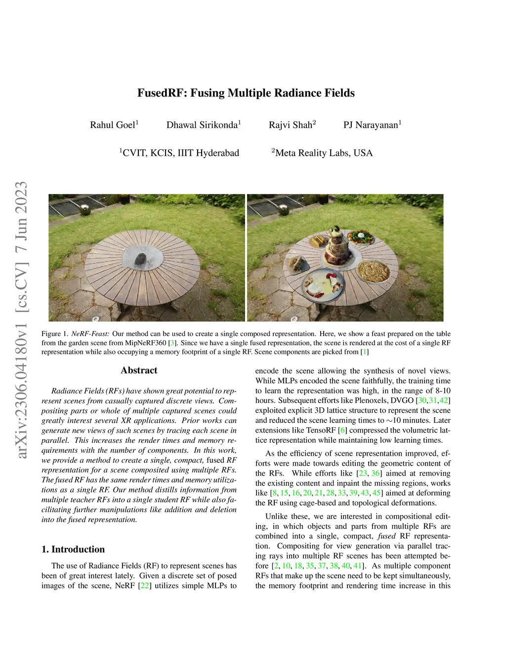 Radiance Fields (RFs) have shown great potential to represent scenes from casually captured discrete views. Compositing parts or whole of multiple captured scenes could greatly interest several XR applications. Prior works can generate new views of such scenes by tracing each scene in parallel. This increases the render times and memory requirements with the number of components. In this work, we provide a method to create a single, compact, fused RF representation for a scene composited using multiple RFs. The fused RF has the same render times and memory utilizations as a single RF. Our method distills information from multiple teacher RFs into a single student RF while also facilitating further manipulations like addition and deletion into the fused representation.