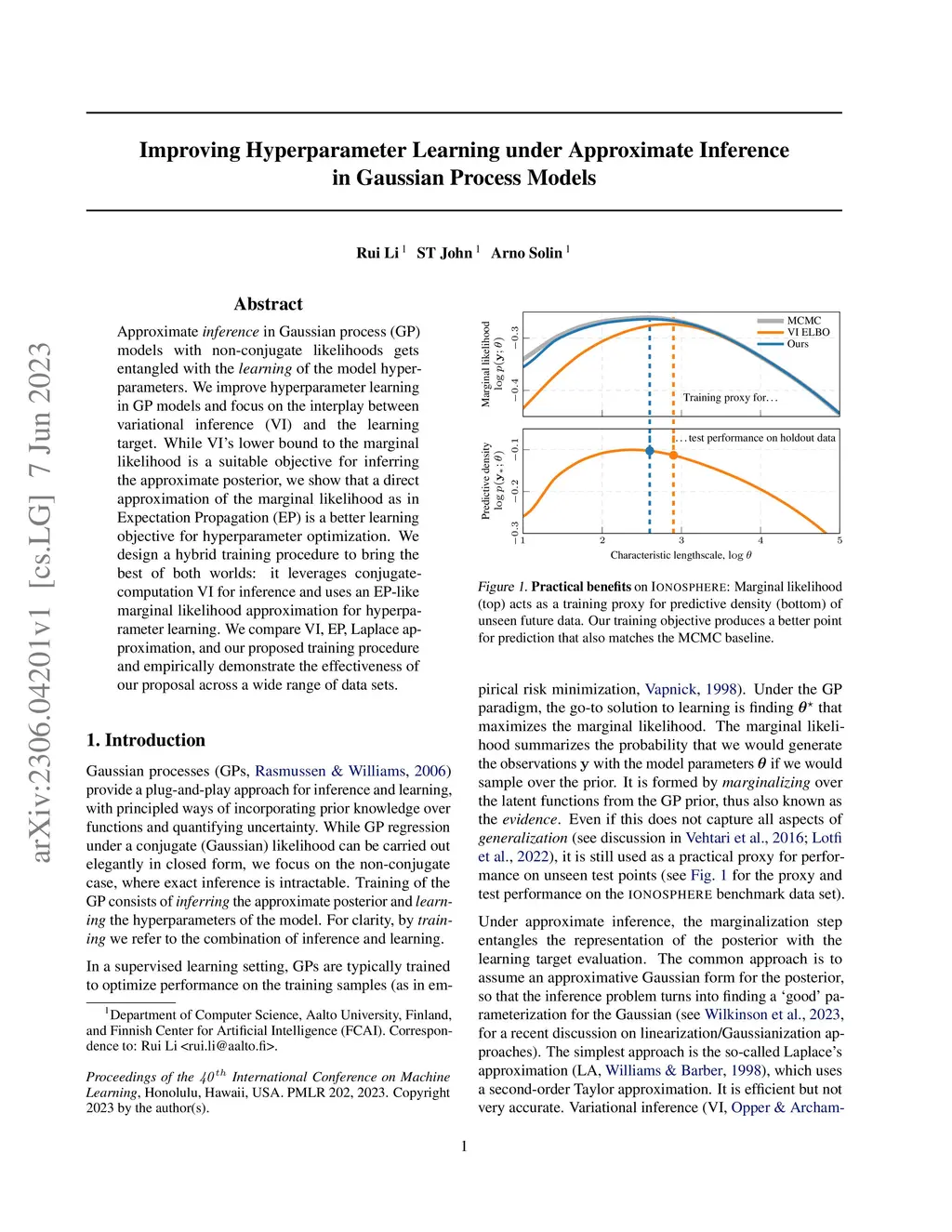 Approximate inference in Gaussian process (GP) models with non-conjugate likelihoods gets entangled with the learning of the model hyperparameters. We improve hyperparameter learning in GP models and focus on the interplay between variational inference (VI) and the learning target. While VI's lower bound to the marginal likelihood is a suitable objective for inferring the approximate posterior, we show that a direct approximation of the marginal likelihood as in Expectation Propagation (EP) is a better learning objective for hyperparameter optimization. We design a hybrid training procedure to bring the best of both worlds: it leverages conjugate-computation VI for inference and uses an EP-like marginal likelihood approximation for hyperparameter learning. We compare VI, EP, Laplace approximation, and our proposed training procedure and empirically demonstrate the effectiveness of our proposal across a wide range of data sets.