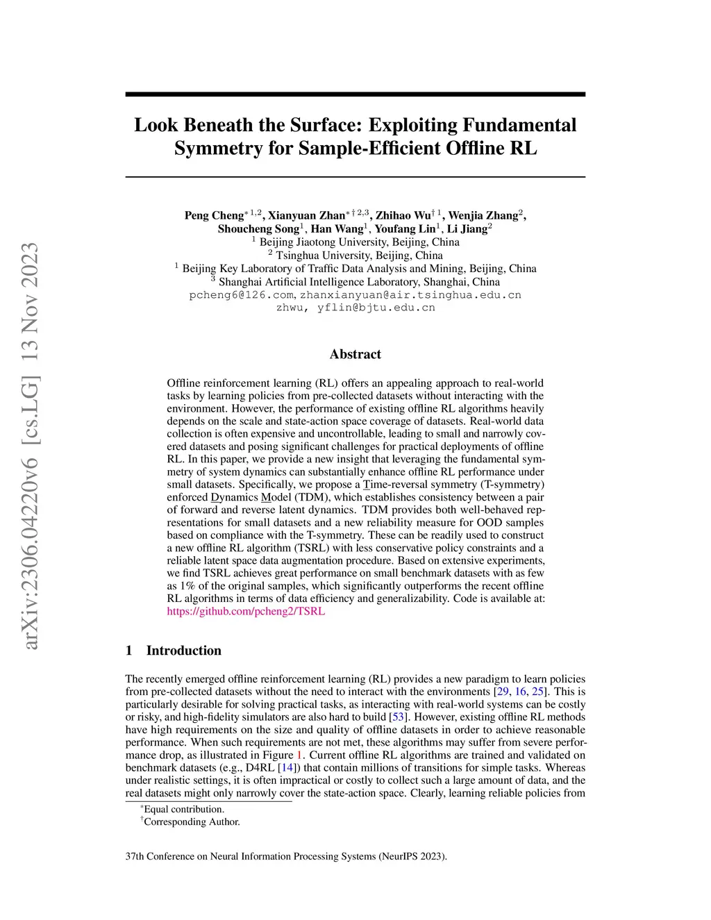 Offline reinforcement learning (RL) offers an appealing approach to real-world tasks by learning policies from pre-collected datasets without interacting with the environment. However, the performance of existing offline RL algorithms heavily depends on the scale and state-action space coverage of datasets. Real-world data collection is often expensive and uncontrollable, leading to small and narrowly covered datasets and posing significant challenges for practical deployments of offline RL. In this paper, we provide a new insight that leveraging the fundamental symmetry of system dynamics can substantially enhance offline RL performance under small datasets. Specifically, we propose a Time-reversal symmetry (T-symmetry) enforced Dynamics Model (TDM), which establishes consistency between a pair of forward and reverse latent dynamics. TDM provides both well-behaved representations for small datasets and a new reliability measure for OOD samples based on compliance with the T-symmetry. These can be readily used to construct a new offline RL algorithm (TSRL) with less conservative policy constraints and a reliable latent space data augmentation procedure. Based on extensive experiments, we find TSRL achieves great performance on small benchmark datasets with as few as 1% of the original samples, which significantly outperforms the recent offline RL algorithms in terms of data efficiency and generalizability.Code is available at: https://github.com/pcheng2/TSRL