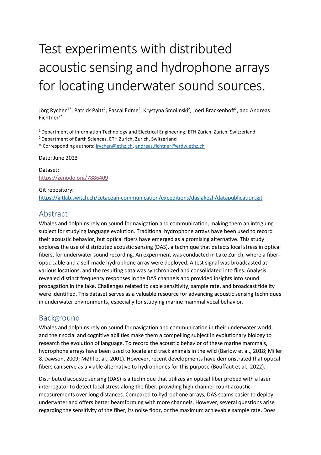 Whales and dolphins rely on sound for navigation and communication, making them an intriguing subject for studying language evolution. Traditional hydrophone arrays have been used to record their acoustic behavior, but optical fibers have emerged as a promising alternative. This study explores the use of distributed acoustic sensing (DAS), a technique that detects local stress in optical fibers, for underwater sound recording. An experiment was conducted in Lake Zurich, where a fiber-optic cable and a self-made hydrophone array were deployed. A test signal was broadcasted at various locations, and the resulting data was synchronized and consolidated into files. Analysis revealed distinct frequency responses in the DAS channels and provided insights into sound propagation in the lake. Challenges related to cable sensitivity, sample rate, and broadcast fidelity were identified. This dataset serves as a valuable resource for advancing acoustic sensing techniques in underwater environments, especially for studying marine mammal vocal behavior.