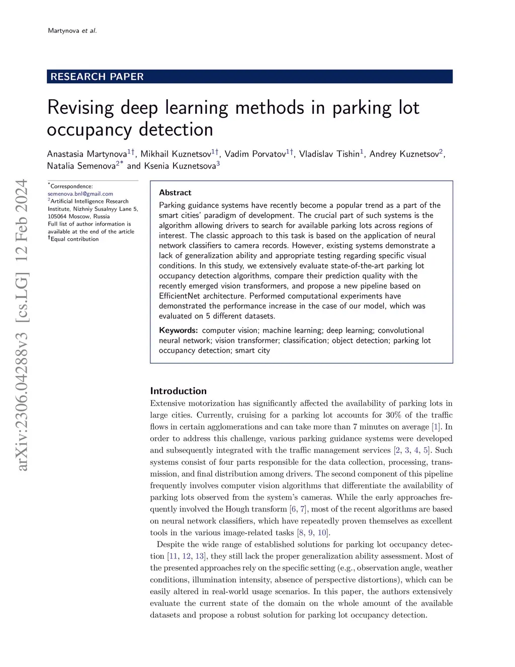 Parking guidance systems have recently become a popular trend as a part of the smart cities' paradigm of development. The crucial part of such systems is the algorithm allowing drivers to search for available parking lots across regions of interest. The classic approach to this task is based on the application of neural network classifiers to camera records. However, existing systems demonstrate a lack of generalization ability and appropriate testing regarding specific visual conditions. In this study, we extensively evaluate state-of-the-art parking lot occupancy detection algorithms, compare their prediction quality with the recently emerged vision transformers, and propose a new pipeline based on EfficientNet architecture. Performed computational experiments have demonstrated the performance increase in the case of our model, which was evaluated on 5 different datasets.